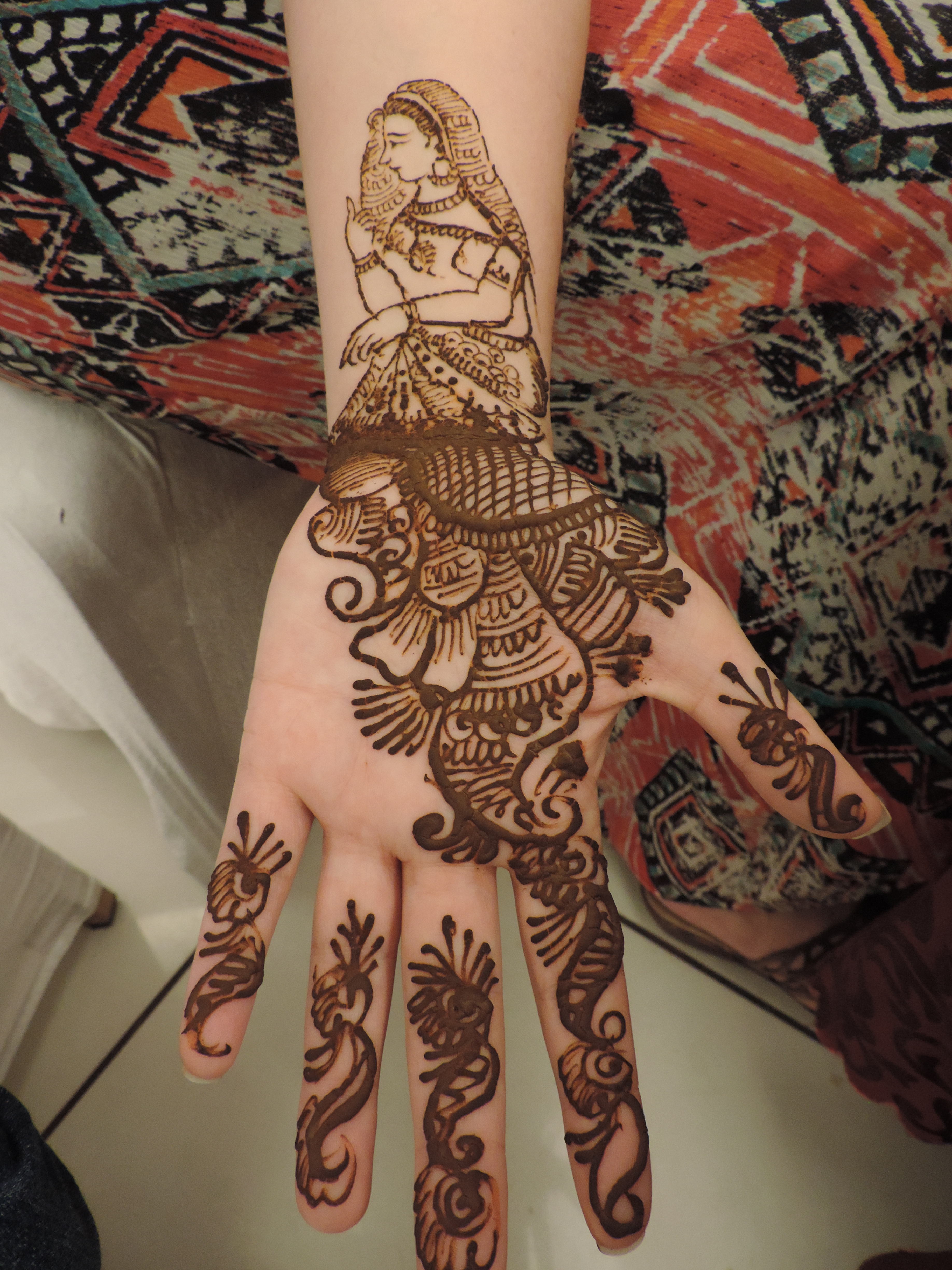 Het spul ruikt een beetje als haarverf (het wordt overigens ook als haarverf gebruikt, veelal door Indiase mannen, ze hebben dan een soort oranje haar). Binnen twintig minuten stond alles erop. De henna moest een uurtje of twee drogen (en zo zaten we dan door rietjes te drinken met onze ellebogen op tafel). En als het eenmaal zover is, valt het er vanzelf af, in korreltjes. De twee dagen daarna werden de afbeeldingen donkerder en nog intenser – uiteindelijk heb ik er ruim een week een hele ingewikkelde set tijdelijke tatoeages van gehad.