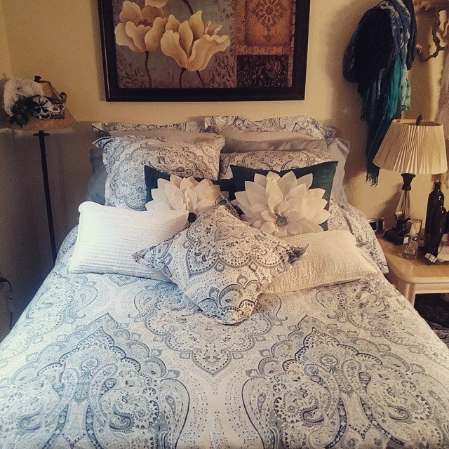 Overigens werken ze hier ook veelal met ‘comforters’: dat zijn een soort dekbedden maar dan met het dekbedovertrek er aan vast gestikt. Dat zit dan in een ‘bedding set’: samen met zo’n comforter-deken zitten er dan kussenslopen in dezelfde stijl bij, een matrashoes waar je op slaapt, een laken voor onder de comforter waar je onder slaapt, en een ‘skirt’: een hoes waar je de onderkant van het bed mee kunt bedekkent, uiteraard allemaal in dezelfde stijl. Het is dus heel gebruikelijk dat men per bed maar een enkele bedding set heeft – terwijl ik er meerdere heb en daarmee de ‘looks’ van ons bed regelmatig kan veranderen.