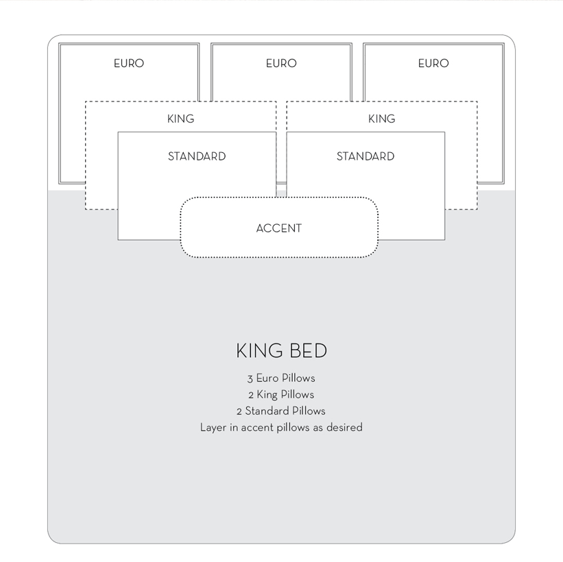 Op ons bed liggen dan ook slechts 2 kussens, eentje voor Michiel en eentje voor mij. Koop je in Amerika een ‘bedding set’, krijg je daar al standard 4 slopen bij – 2 voor gebruikskussens, en 2 voor sierkussens. Maar daarmee ben je er nog niet! Je moet volgens de regels minstens 5 kussens op bed doen, en bij een King bed eigenlijk 8, van allerlei groottes. Volgens Pottery Barn moet het zo: