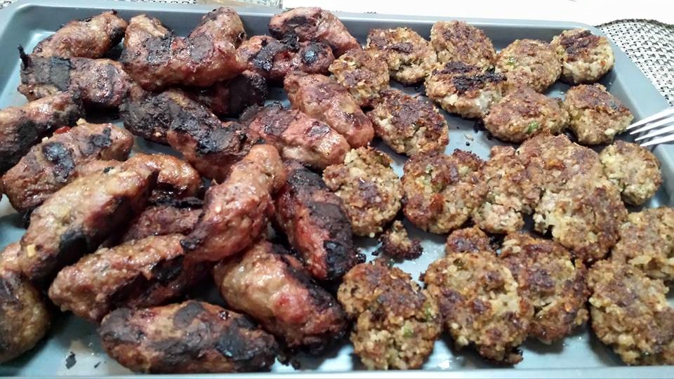 - Als voorgerecht: Drie soorten köfte (een soort Turkse hamburgers): een half-lamsvlees-half-rundvlees versie, een half-rundvlees-half-bulgur versie met munt, en een half-linzen-half-burger versie in een slablad. Met mijn eigen saus van creme fraiche met bosuitjes.