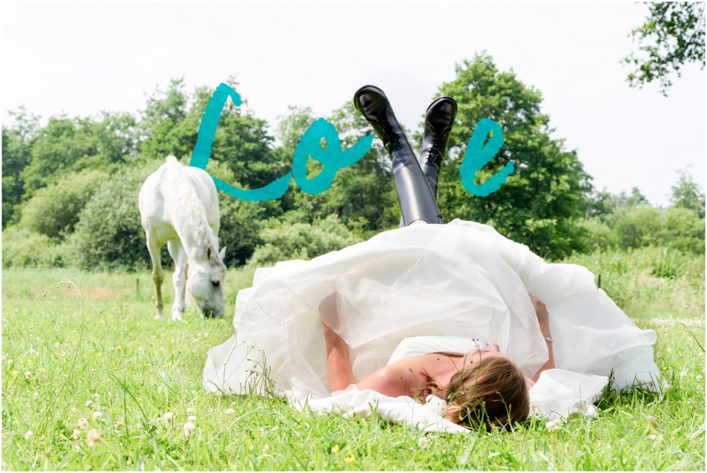 Prachtig, prachtig. Terwijl Linda haar klaarmaakte bij haar ouders thuis in Zwartsluis, kwam Klaas dus naar Klooster. Na zijn pannenkoeken kleedde hij zich aan. Miranda Vijfvinkel (onze eigen trouwfotograaf, de creatiefste mens op aarde, en uiteraard ook hier aanwezig!) was daarbij voor de registratie. Toen Klaas klaar was, ging hij Linda ‘ophalen’ bij het ouderlijk huis, vanaf waar ze een fotoshoot gingen maken. Assistentie door Hendrieke, en dat was nodig, want er was nog een figurant: Wanted, het paard van Linda. En wat heeft dat mooie, creatieve foto’s opgeleverd!! Klik vooral hier door naar de pagina van Miranda, want daar staan er nog meer!