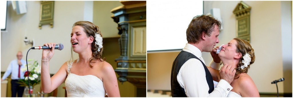 Na weer wat foto’s gingen we naar de kerk in Zwartsluis voor de trouwdienst. Het mooiste onderdeel was het lied dat Linda zong voor Klaas… bij zin drie zat ik al in tranen. Nou heb ik een excuus: Linda had mij gevraagd om de tekst te vertalen en ik wist dus wat komen ging… Ik was ook zeker niet de enige – de halve kerk zat te snotteren, en broerlief zat vooraan ook tegen z’n tranen te vechten. Zo mooi…
