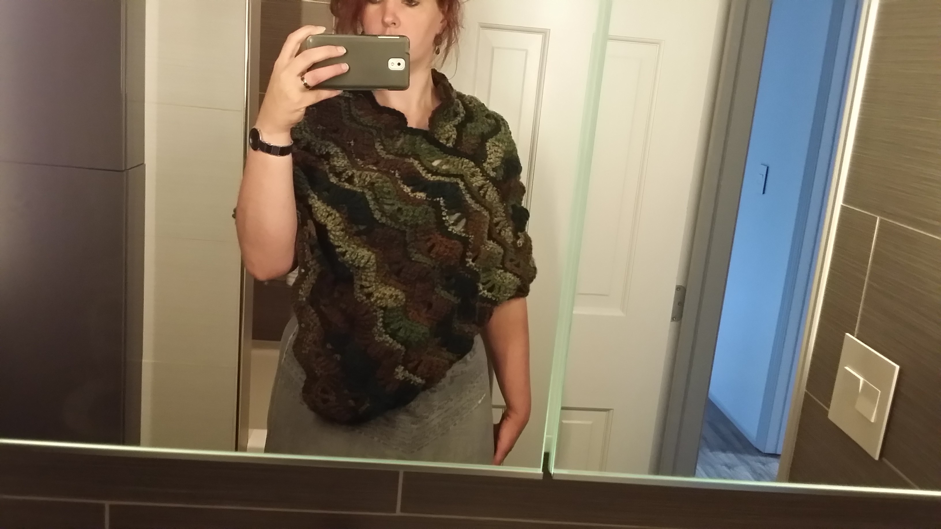 Ik kon wel haken. Ik had nog wat wol liggen (nou ja, zes bollen van deze kleur) en dit is het resultaat. Het haakte heel snel weg, dus het kostte me slechts een uurtje hier ’s avonds en een uurtje daar… en tadaa… weer een warme omslagdoek!