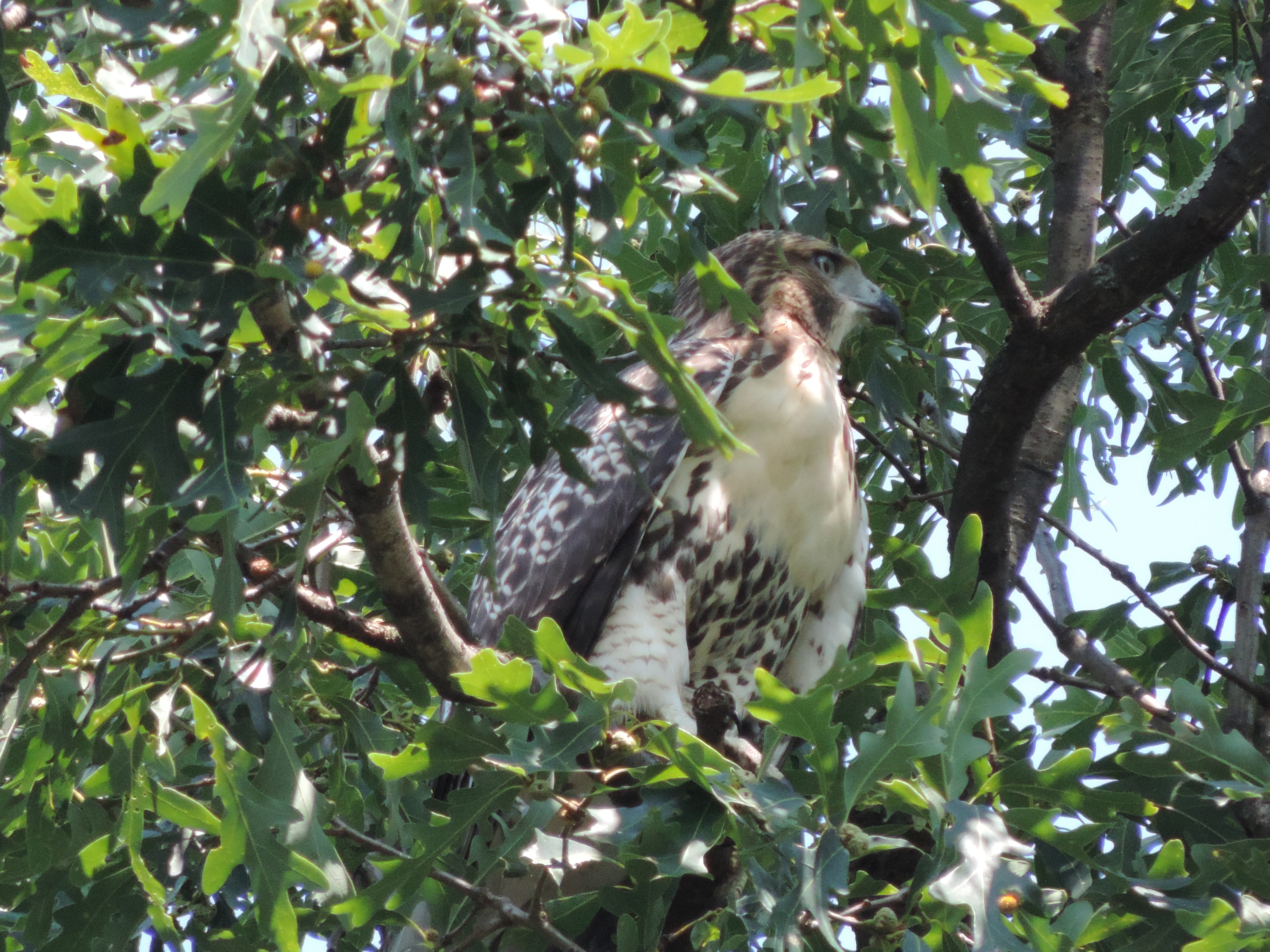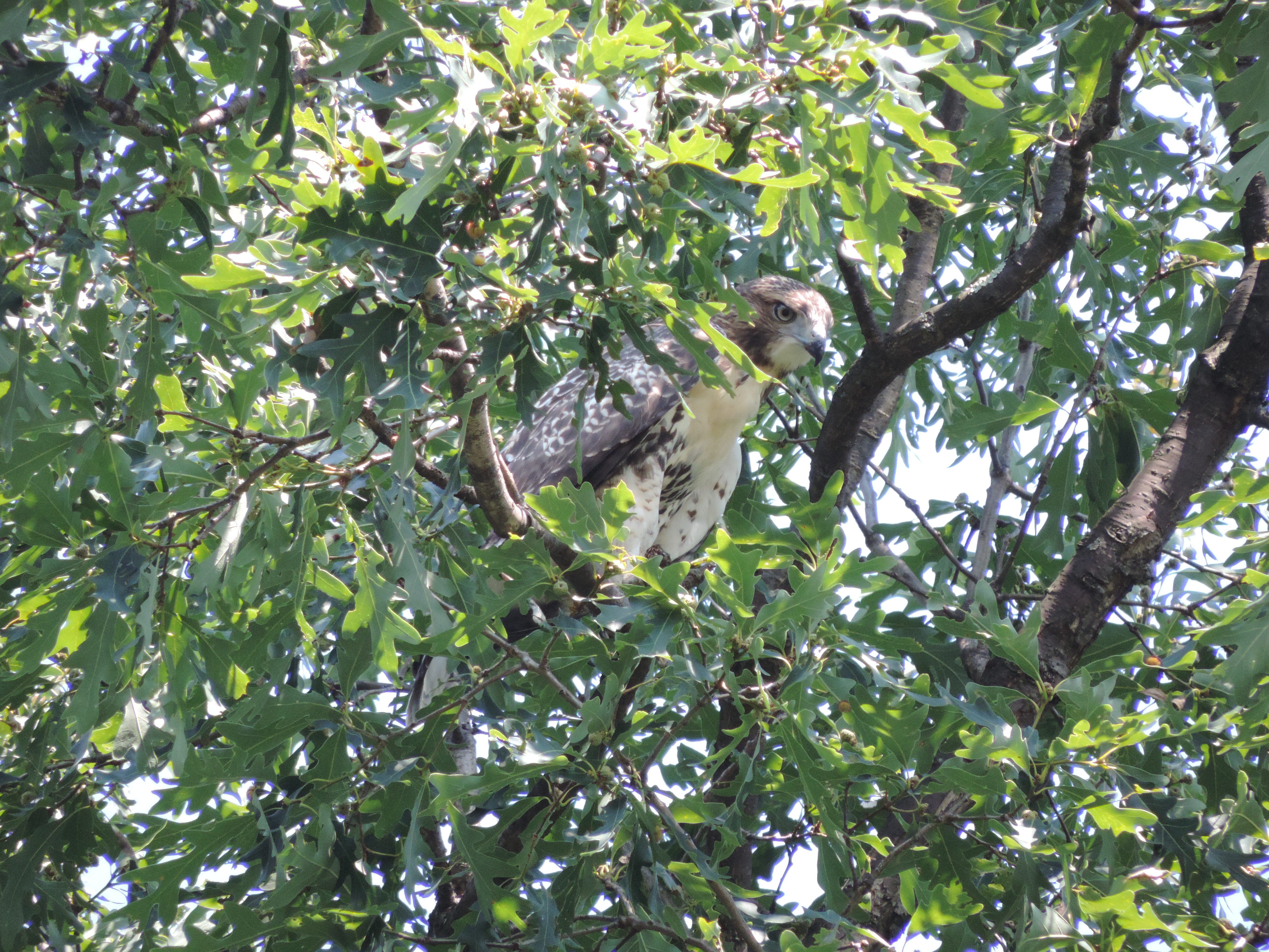 Uiteindelijk heb ik hem gevonden. Het is een red-tailed hawk, maar dan heeft ie geen zichtbare rode staartveren. Ze staan tenminste niet op de foto, ik heb ze ook niet gezien, misschien zijn die verstopt of heeft alleen vader-vogel die dingen. Of is het een regionale aanpassing… Ik heb inmiddels een hoop foto’s gevonden van jonge vogels bij ons in de regio die er wel op lijken – de Wikipedia foto’s zijn wat misleidend.
