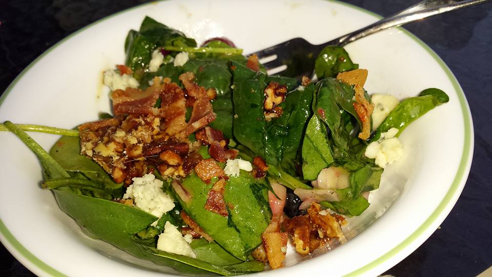 En een heerlijk spinaziesalade met bacon, aardbeien, gesuikerde pecannoten en blauwe kaas