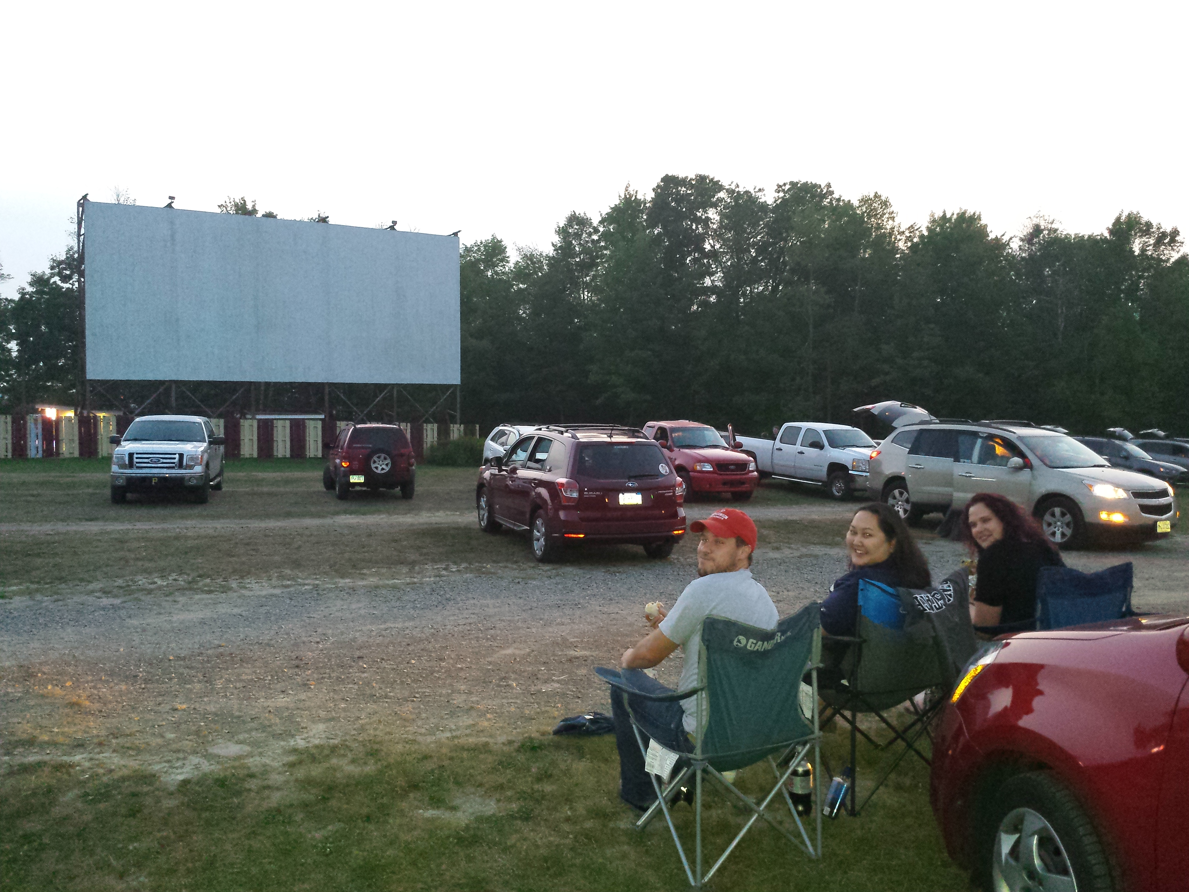 Folding chairs (klapstoelen). Want hoewel je ook vanuit je auto de drive-in kunt bekijken, zetten de meeste mensen stoelen buiten de auto in het gras. Je draait dan de ramen naar beneden, zet de radio op maximaal (afgestemd op de frequentie met het filmgeluid), en kijken maar. Ik heb ook een aantal mensen zien zitten in hun kofferbak, met hun benen over de rand bungelend. En ik heb een aantal ‘trucks’ gezien waar mensen dan in de laadbak gaan zitten, op een bankje of iets dergelijks. Ook gezellig.