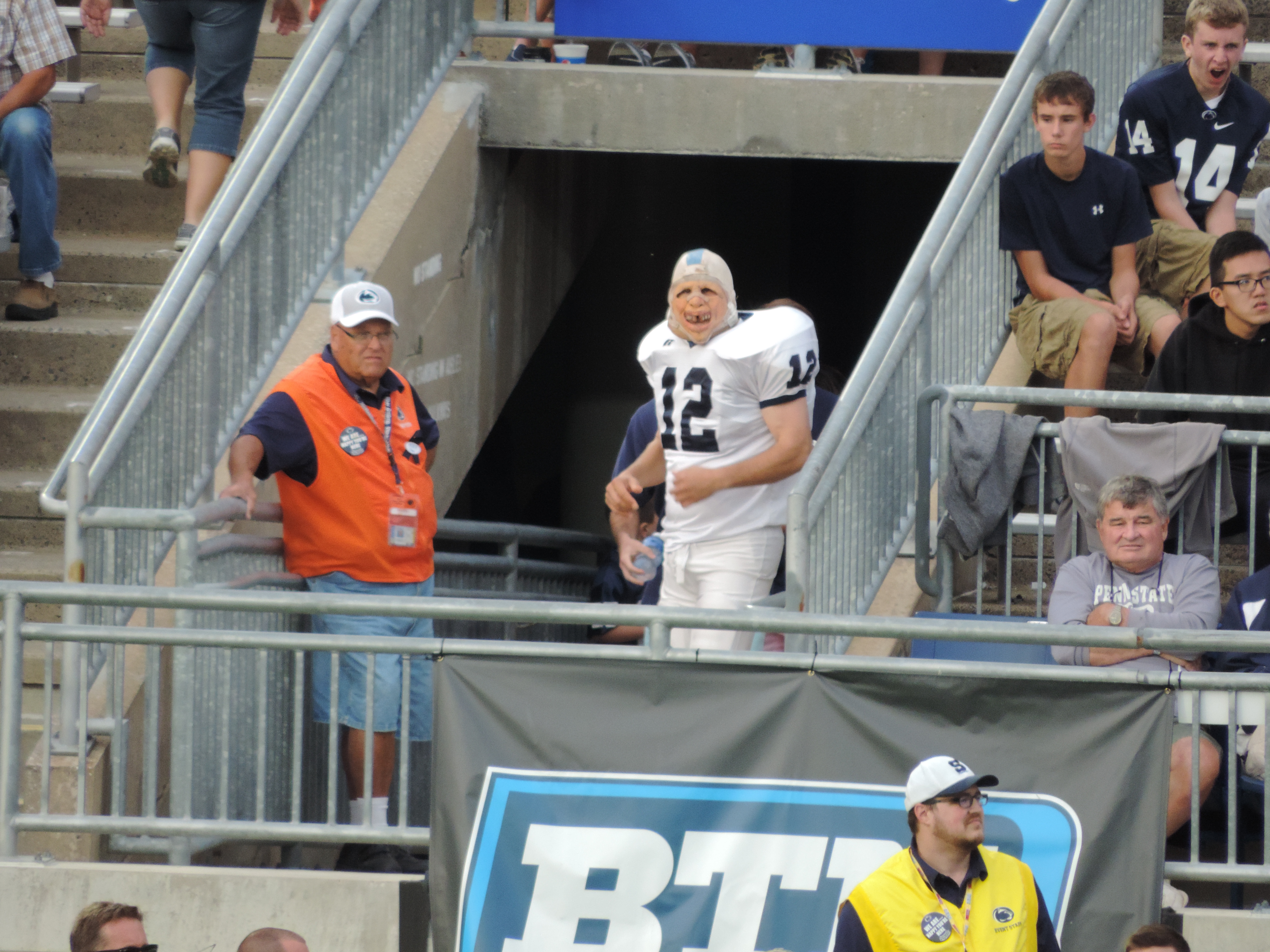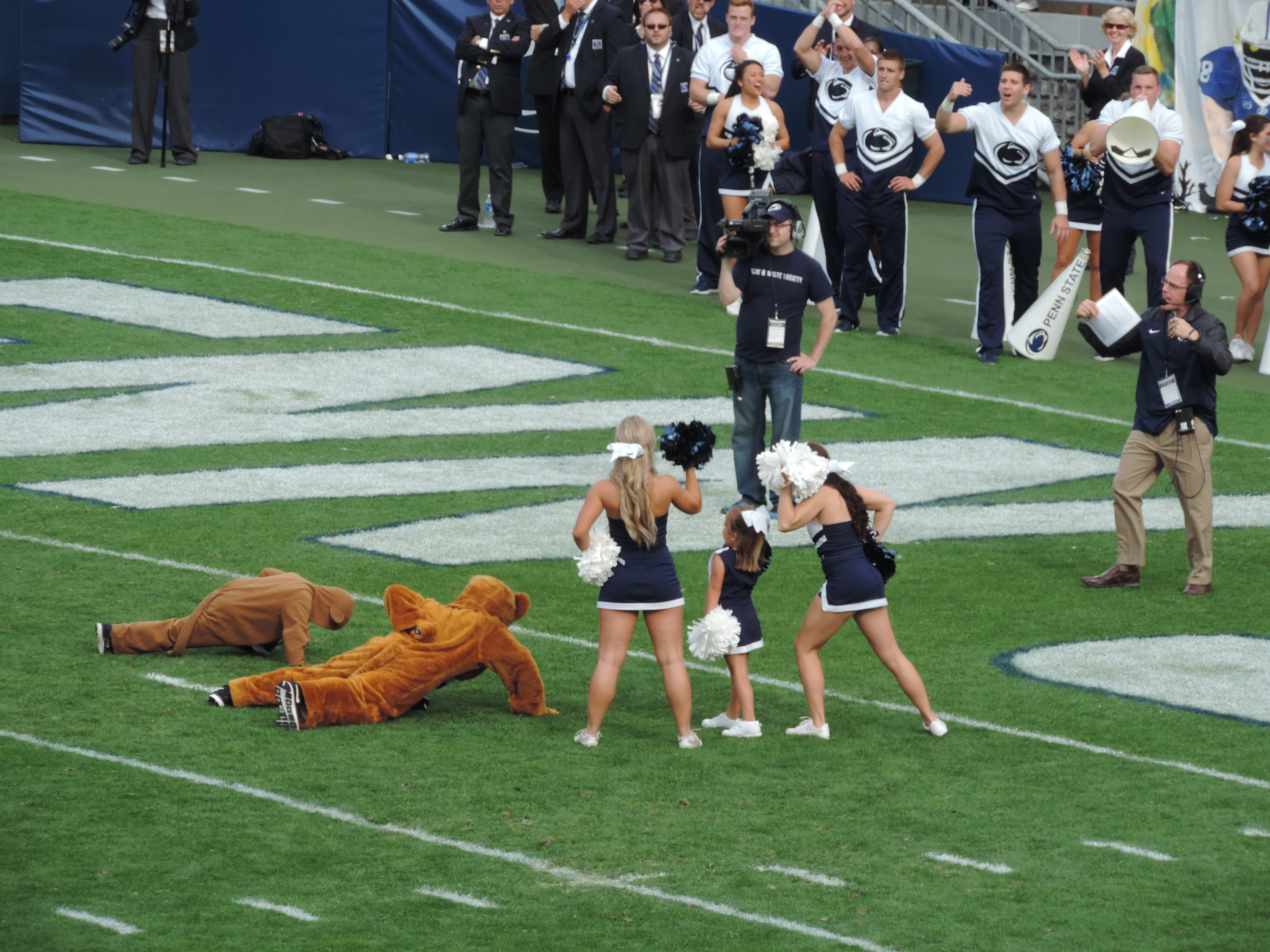 En toch, de dag vloog voorbij. Hendrieke en Robin – zelf ook in hun blauw-witte Penn State kleren – vonden het absoluut niet saai. Er was constant wat te zien en doen in het stadion, en volgens mij konden ze de wedstrijd nog wel aardig volgen ook. Robin vanwege z’n rugby kennis uit Zuid Afrika; Hendrieke vanwege de uitleg van Michiel. En ja, ik ben er om de Nittany Lion, de Drum Major en de Blue Sapphire-majorette, en de cheerleaders aan te wijzen (dat weet ik dan weer).