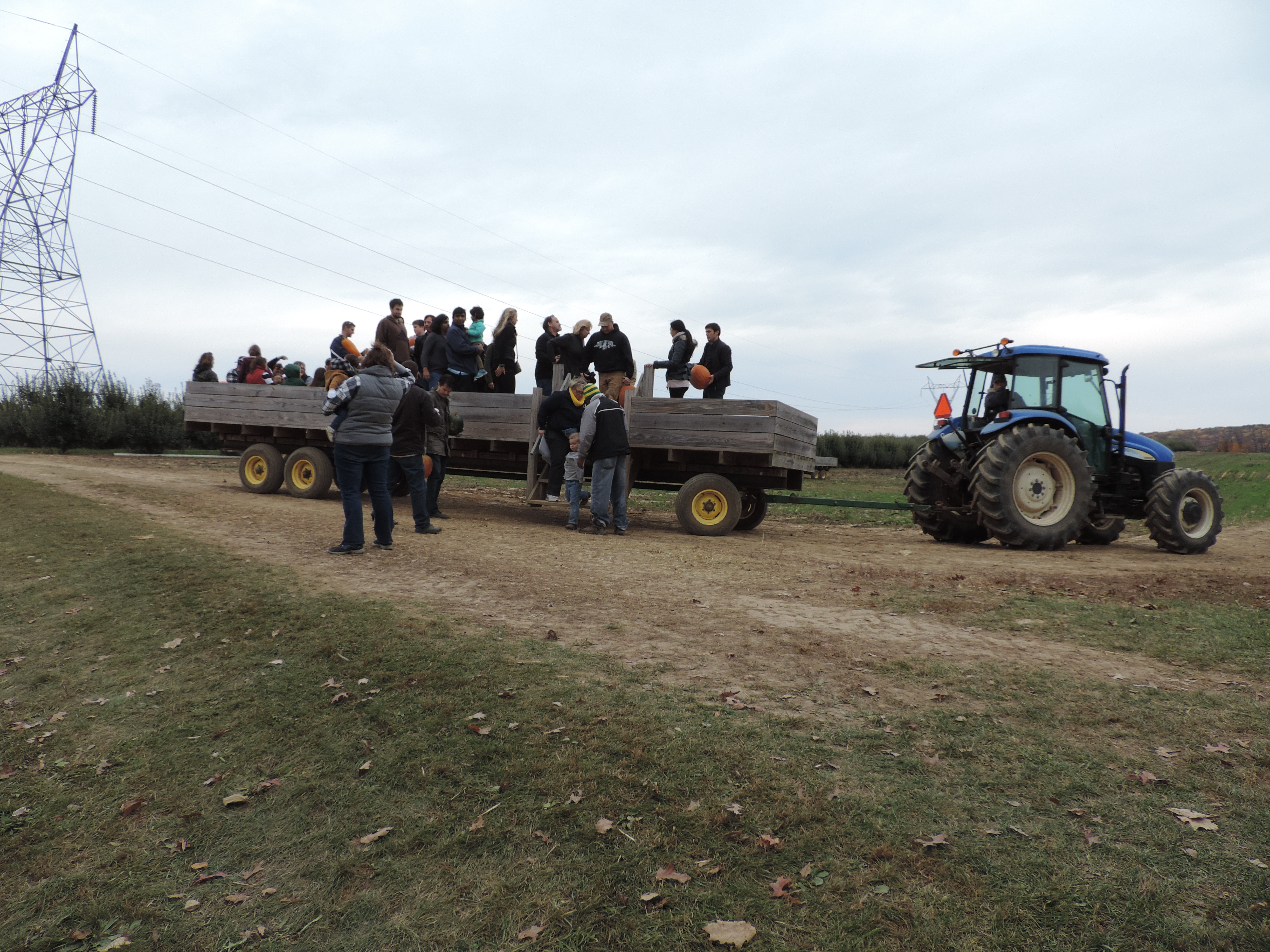 Na de lunch zijn we naar Way Fruit Farm gegaan, een fruitboerderij met boerderijwinkel waar we destijds ook met Bert en Annet zijn geweest. Ze hadden daar het ‘pumpkin-festival’, wat onder andere inhield dat bezoekers met een wagen (platte kar achter een tractor) naar het pompoenenveld mochten rijden om daar hun eigen pompoen uit te kiezen en zelf te plukken. Nou, dat leek ons wel wat, aangezien we de volgende dag pompoenen nodig hadden voor het pumpkin-carving. En jawel hoor, we hebben twee mooie pompoenen gevonden! En nu we er toch waren… moesten we uiteraard twee zakken vol met nieuwe appels hebben. Heerlijk!