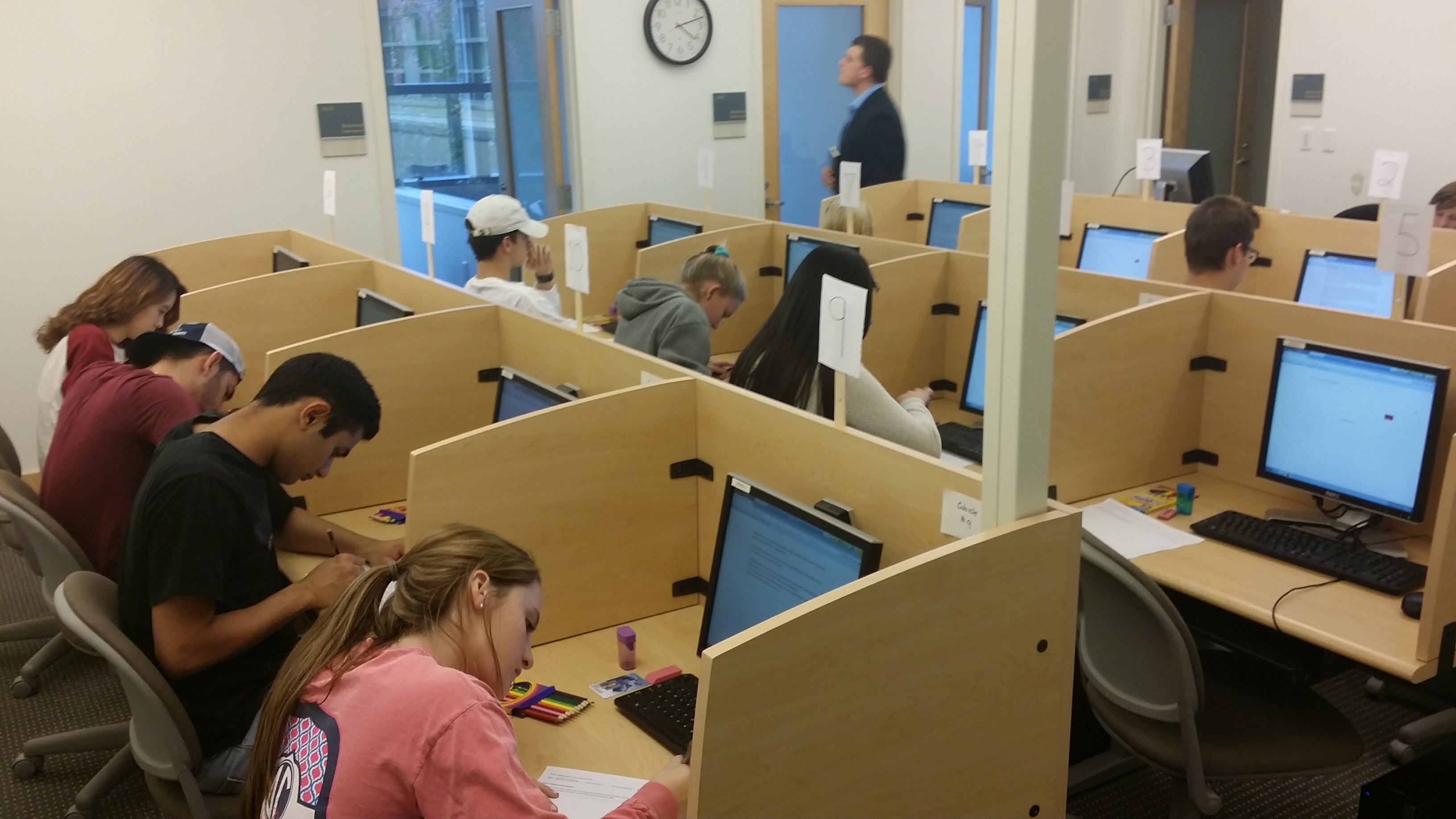 Ons laboratorium heeft 12 zitplaatsen (‘cubicles’). En mijn experiment duurde bijna een half uur. Dat is best lang, maar ik had er een creatieve taak in zitten… en dat half uur vloog voorbij! Ik was van tevoren nog naar de Walmart en Target geweest om 12 setjes met kleurpotloden (met 12 gums en 12 puntenslijpers!) te halen – want mijn respondenten moesten namelijk een creatief idee tekenen in een deel van dat half uur. En sommigen gingen helemaal los!
