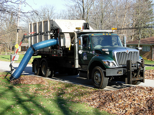 De 'leaf collector' (een blaadjes-stofzuiger-vrachtwagen)