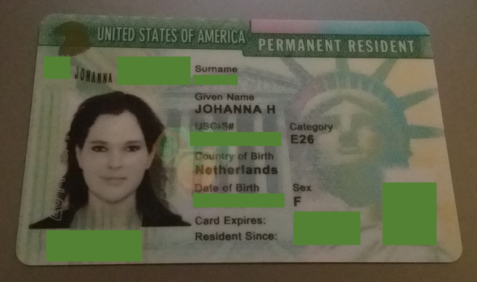 Mijn green card (met wat details weggehaald, dit blog wordt aardig goed gelezen en alles staat vrij op internet)