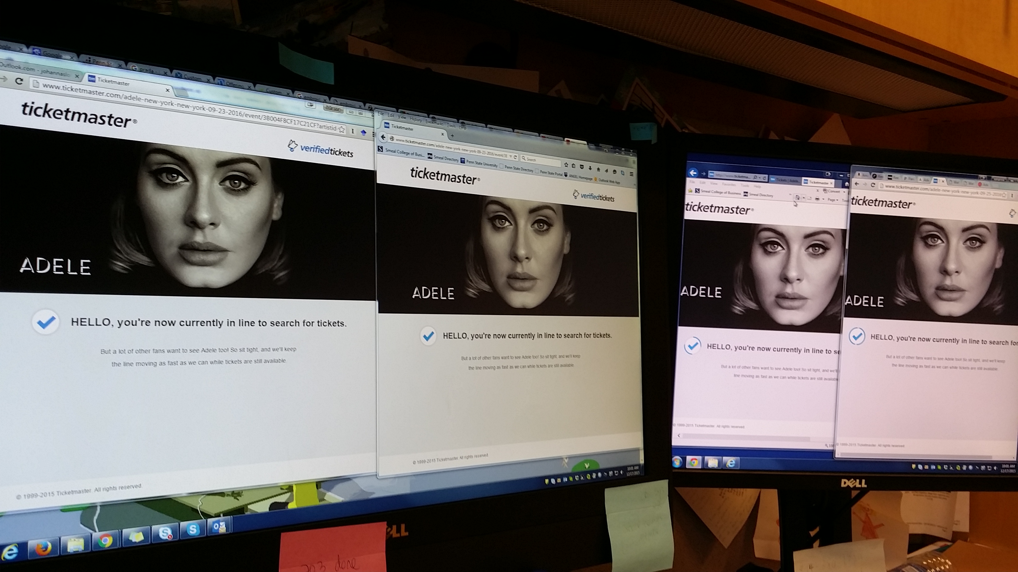 En zowaar kreeg ik nog een kans, want gisteren hoorde ik dat Adele ook naar Amerika komt! Helaas zit daar State College niet bij, maar wel New York (een stuk of zes data), Washington DC (twee data) en Philadelphia (twee data). En dus zat ik vanochtend weer met meerdere browsers open te wachten in de rij. Emma deed hetzelfde vanuit Pittsburgh. En Michiel zat ook met meerdere computers klaar… EN WAT GEBEURT ER? Michiel komt er op de een of andere manier opeens door, en hij kan gewoon tickets kopen! Er zit een max op van 4 tickets en wij wilden er eigenlijk 5 (Peter, Michiel en ik, en dan Emma en Corey – Emma zou niet zonder Corey gaan in dit geval) dus we hadden besloten dat wij er dan 3 zouden kopen, en Emma nog eens 2. Zo gezegd, zo gedaan. Ondertussen werd ik helemaal blij en enthousiast en alles tegelijk….