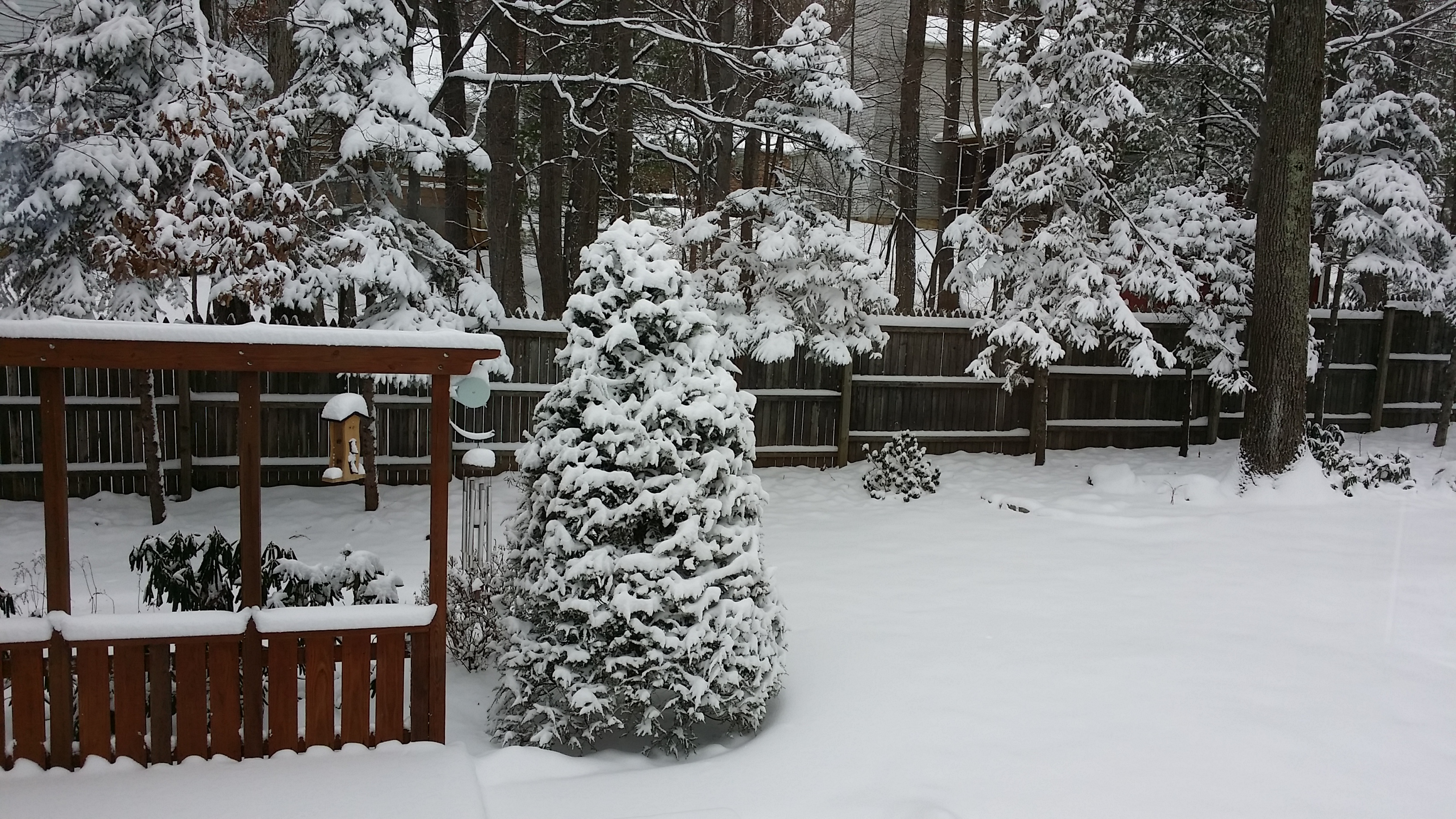 Sneeuw in onze achtertuin. Alles is wit!