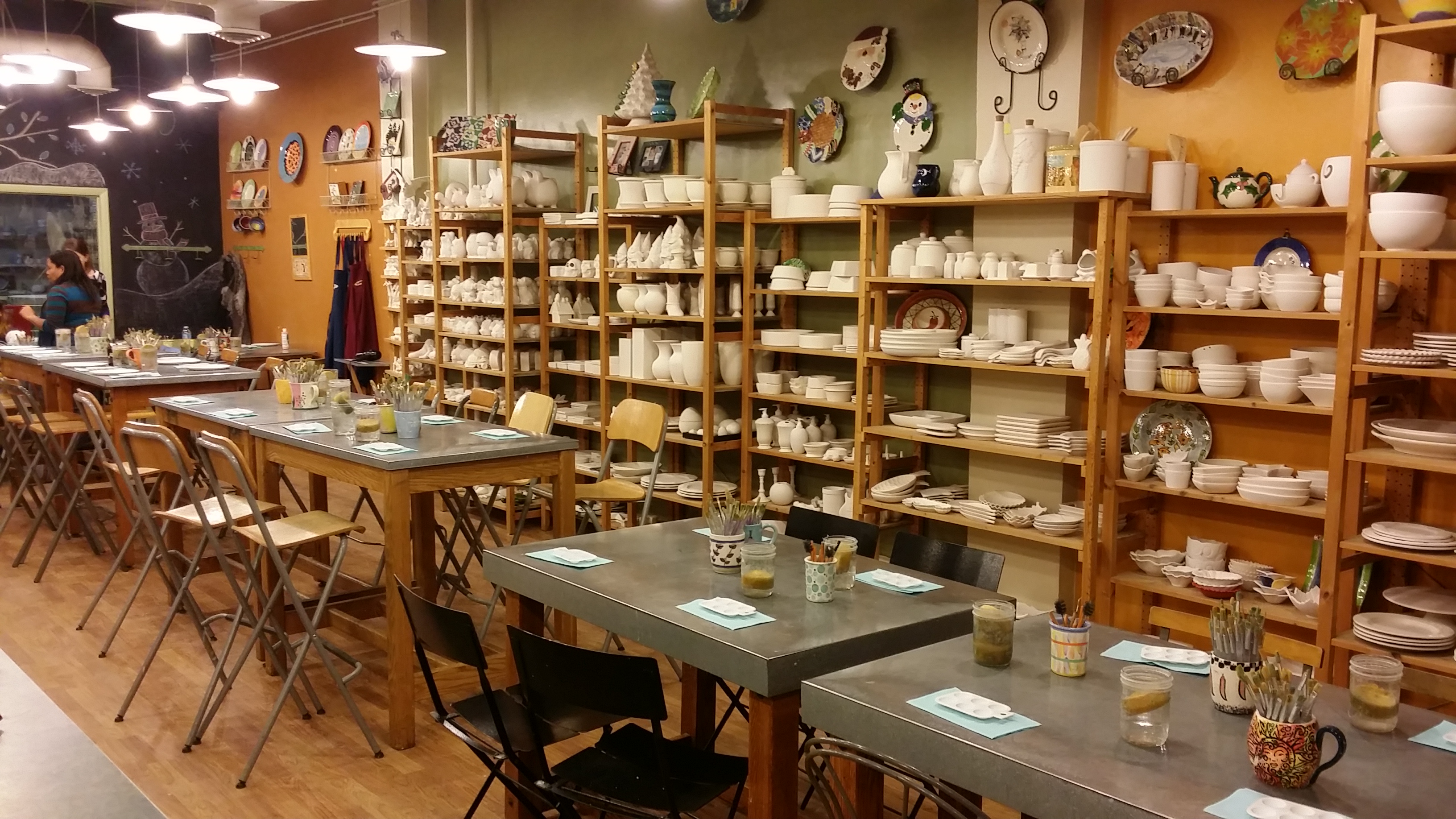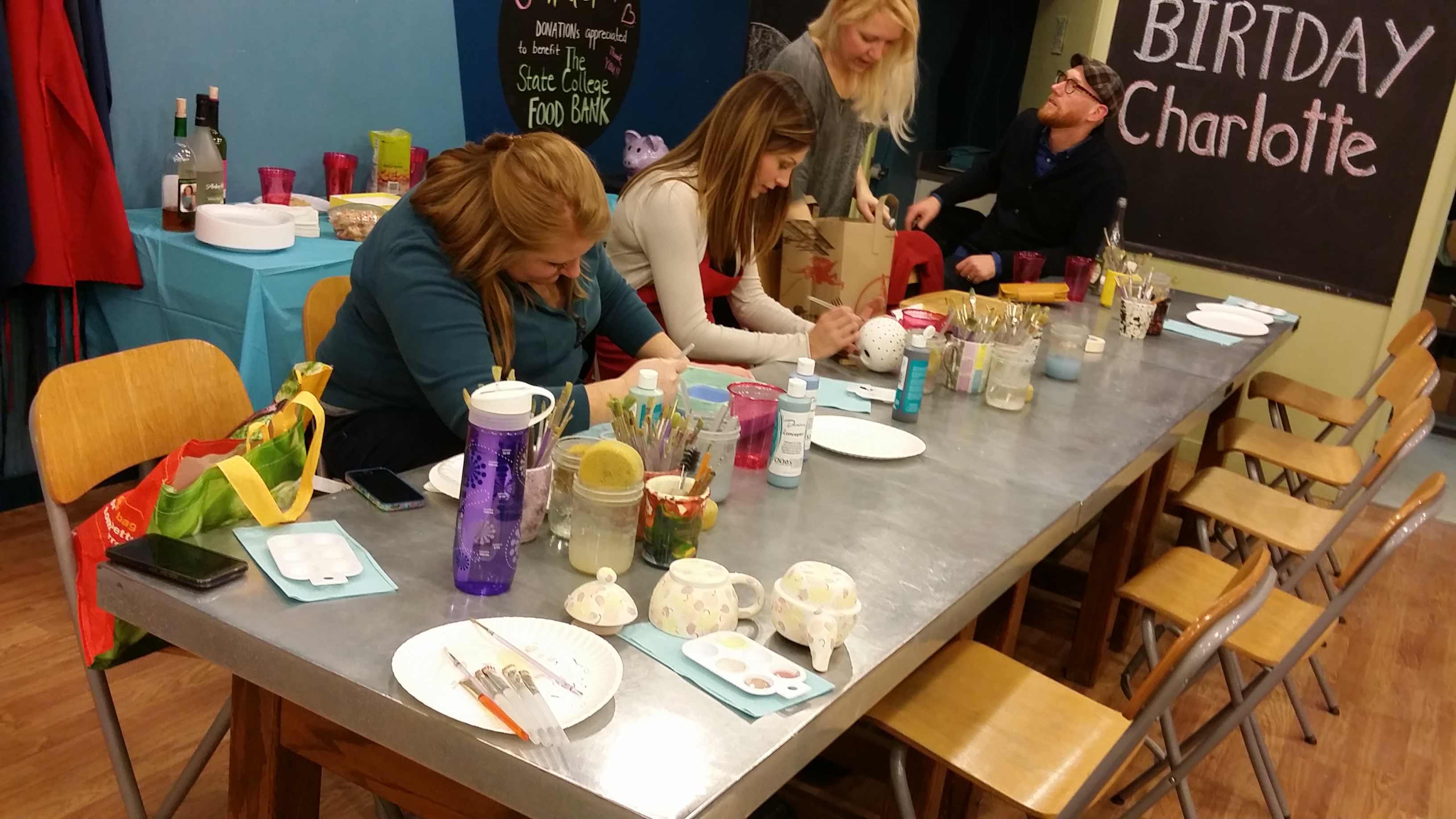 In downtown State College hebben wij een aardewerkstudio genaamd 2000 Degrees waar je een stuk servies naar keuze (borden, kopjes, schalen) of een beeldje van het een of ander kan schilderen. De keuze is enorm. Ze hebben er ontzettend veel kleuren en soorten verf, en hebben ook heel veel accessoires voor allerlei technieken – denk aan ets-messen, sponzen, schuurpapier, stempels en stencils. Het concept is als volgt: voor 6 dollar per uur (maximaal 9 dollar) en de kosten voor het aardewerk wat je kiest kun je onbeperkt schilderen. De zaak zorgt voor het glazuren van je werkstuk en het afbakken ervan. Na een paar dagen kun je het ophalen.