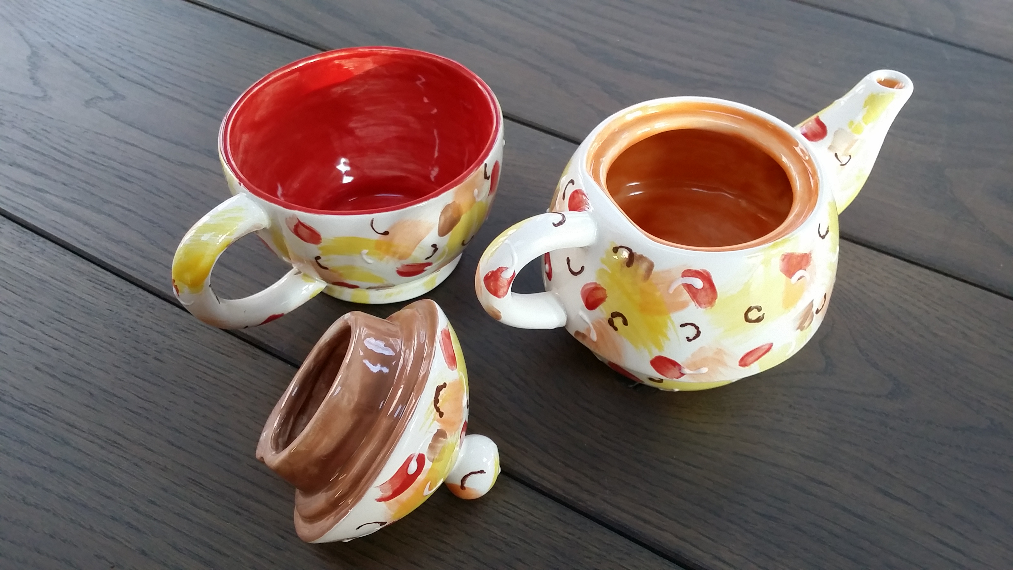 En wat kon ik niet kiezen… er was gewoon te veel keus! Een vaas, een grote mok, een uit de kluiten gewassen theekop, een theepot… of toch een groot bord? (Ik moet nog een keer terugkomen, dat is zeker!). Ik heb gekozen voor zo’n theepotje waar ook een kopje ‘onder’ zit. Het is bedoeld om te gebruiken – en is ook veilig voor de magnetron en afwasmachine. De volgende kwestie – hoe moest ik ‘m beschilderen? Hmm… Uiteindelijk heb ik met wat steeds kleiner wordende vegen van geel, oranje, rood en bruin de buitenkant versierd, en de binnenkanten van de drie delen bruin, oranje of rood gemaakt. Met een speciale reliefverf heb ik met donkerbruin en wit vervolgens weer wormpjes op de vegen aangebracht (dat was lastig).