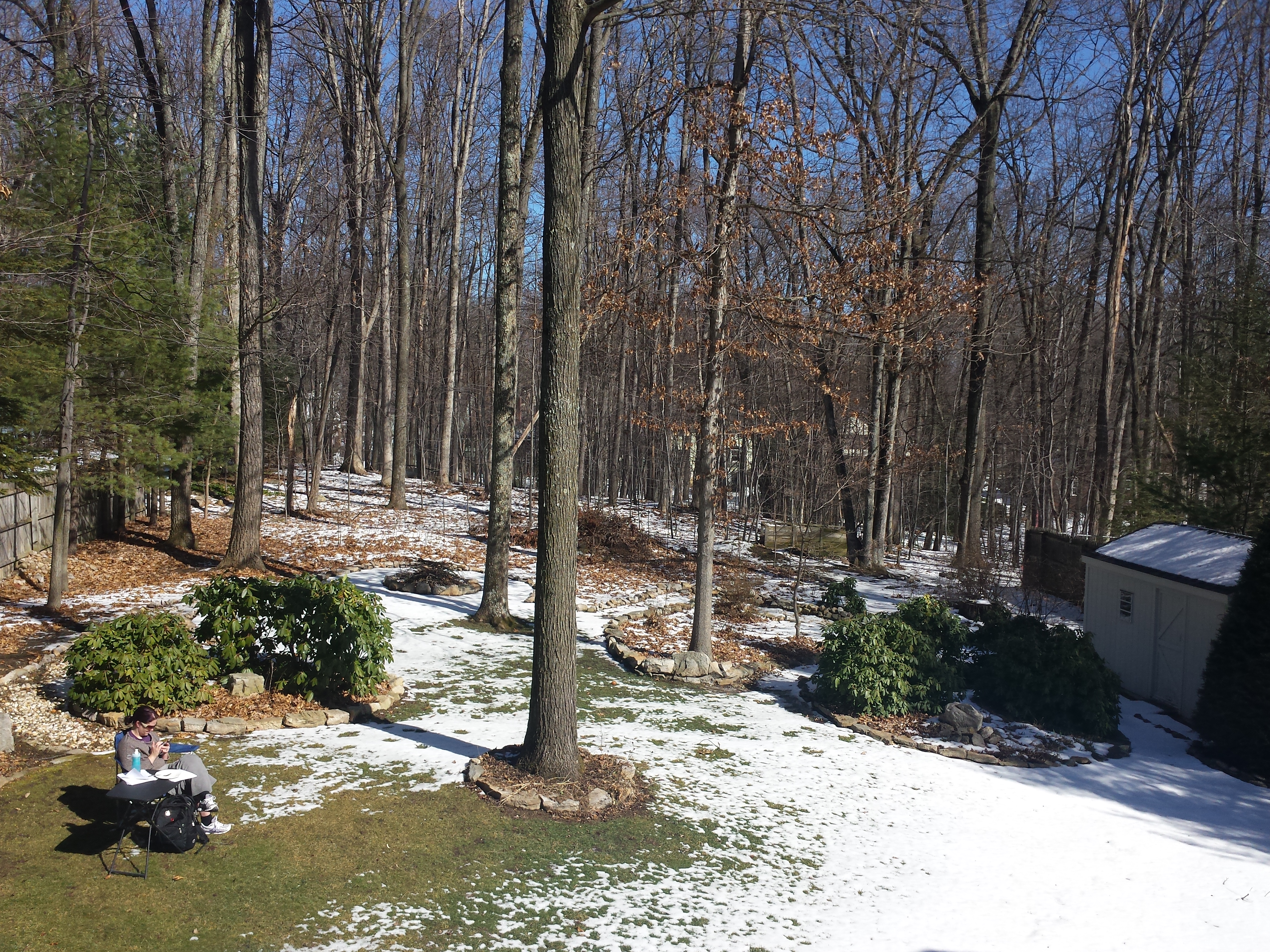 We hebben hier momenteel ook een unieke onweersstorm in februari. Heftige flitsen, heftige klappen onweer, heftige regen. En dus een regenboog aan het begin van de avond. Had ik al gezegd dat we hier Heel Koud weer hadden vorige week? Afgelopen zaterdag heb ik, omringd door sneeuw (en nakijkwerk), buiten gezeten in de zon met 17 graden celcius. En vandaag vroor het weer. Raar weer, hier in Pennsylvania!