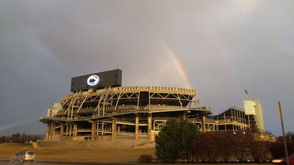 In Nederland kennen we het verschijnsel ‘regen’, en ook wel het verschijnsel ‘zon’. In Nederland zijn we ook wel gewend om ze alletwee tegelijk te hebben – en dan komt er vaak een regenboog. Mooi, dat altijd, maar niet noemenswaardig. Zelfs een ‘dubbele regenboog’ kennen we, en daar kijken we eigenlijk niet van op (sterker nog, ik heb wel eens een keer een vierdubbele regenboog gezien – dat was wel apart). Hier in State College ligt dat anders.