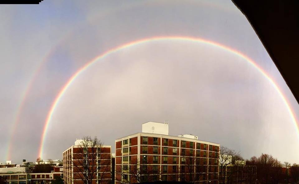 De dubbele regenboog boven de studentengebouwen tegenover de business school – foto van Lori van Smeal