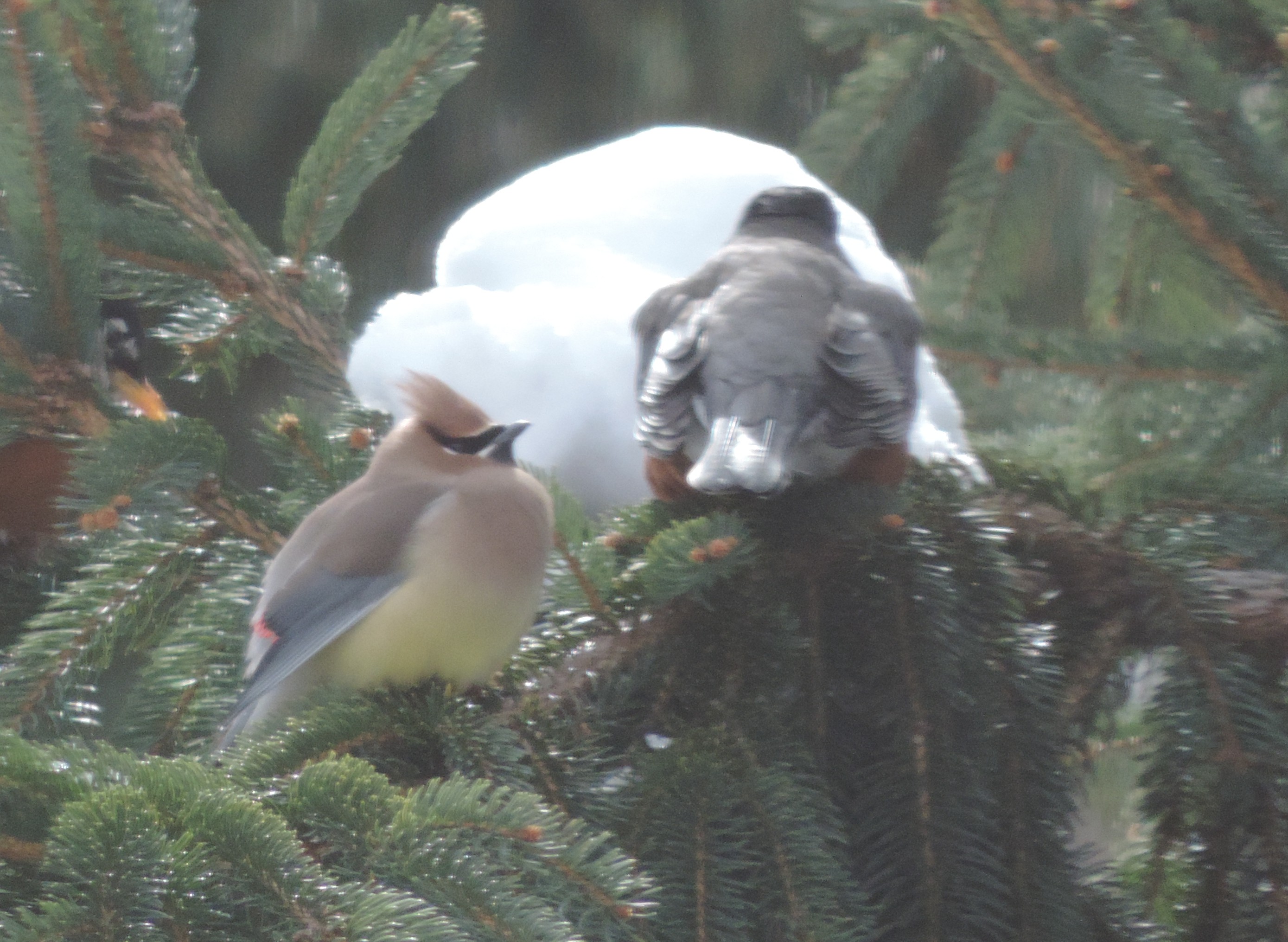 En dan deze. Dit is een hele bijzondere vogel: de Cedar Waxwing. Een kuif, een soort mascarastreep met witte randjes rond de ogen, een bruin-grijze rug en borst, een gele buik, en aan het einde van de grijze vleugels een een rode rand met zwarte accenten. Toen ik in Austin, Texas woonde, heb ik een paar keer een hele zwerm van honderden van deze Cedar Waxwings tegelijk gezien – die kwamen allemaal tegelijkertijd besjes eten van de bomen die naast mijn huis stonden. Daar heb ik overigens ook hele mooie foto’s van gemaakt destijds (waarschijnlijk mijn mooiste vogelfoto ooit).En laatst zag ik precies die vogel laatst buiten zitten, hij zag in een spar te ‘eten’ van een homp sneeuw, naast twee Red Robins. Het was zo’n moment dat ik mijn camera al klaar had liggen (dat gebeurt vaker).. En nee, de foto is niet helemaal scherp, en ja, ik had liever dat de twee Red Robins die ook op de foto staan wat anders zouden zitten, maar de Cedar Waxwing is wel goed te zien. Klik-klik – en toen was de vogel weer gevlogen (en ik heb ‘m niet meer teruggezien). Gelukkig hebben we de beelden nog… Mooi ding he? Ik word daar toch echt blij van!