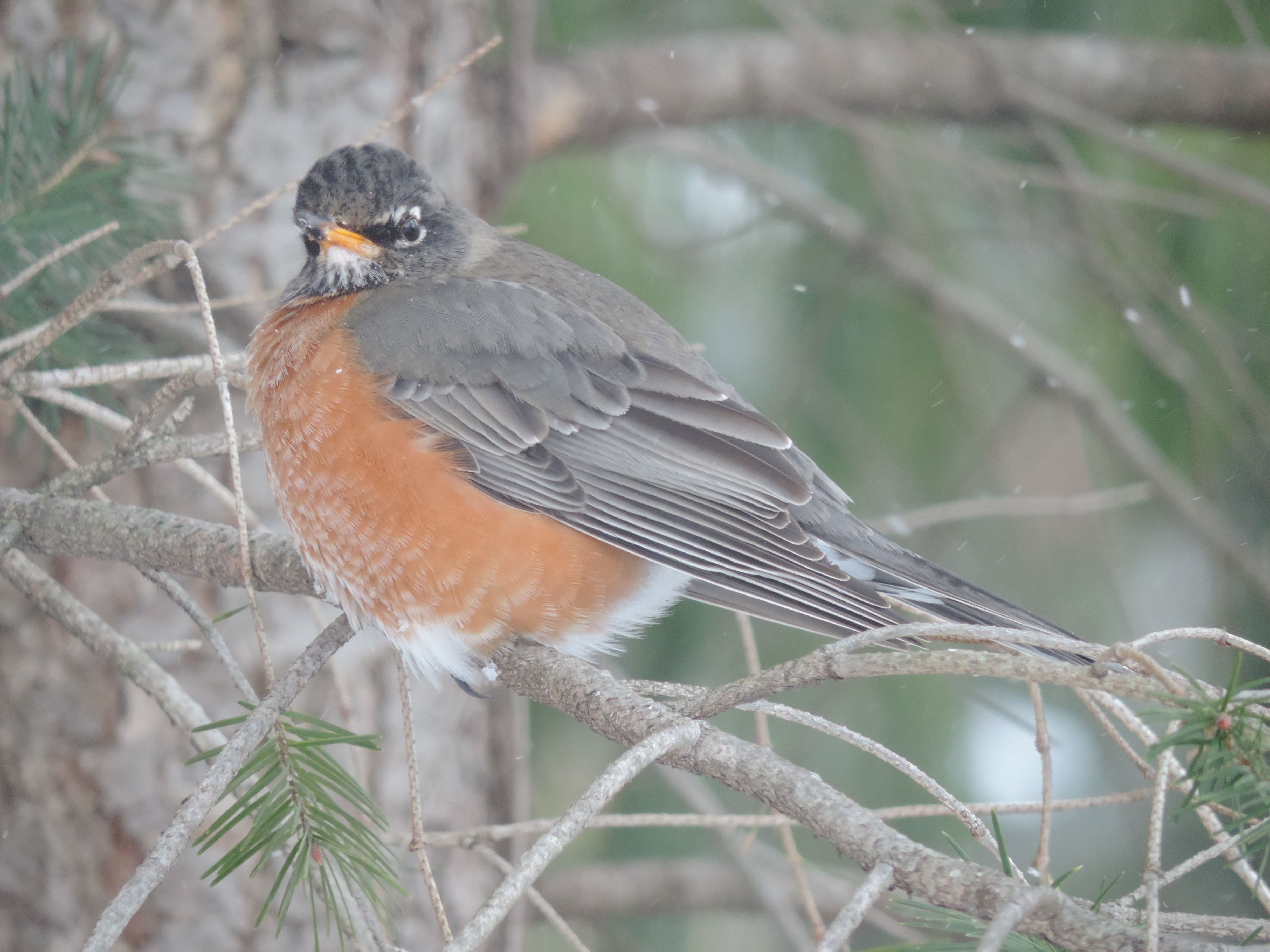 Dan nog een mooie geposeerde foto van de Red Robin (is wat beter dan de ‘kontenfoto’ dan die met de Cedar Waxwing hierboven), in de sneeuw: