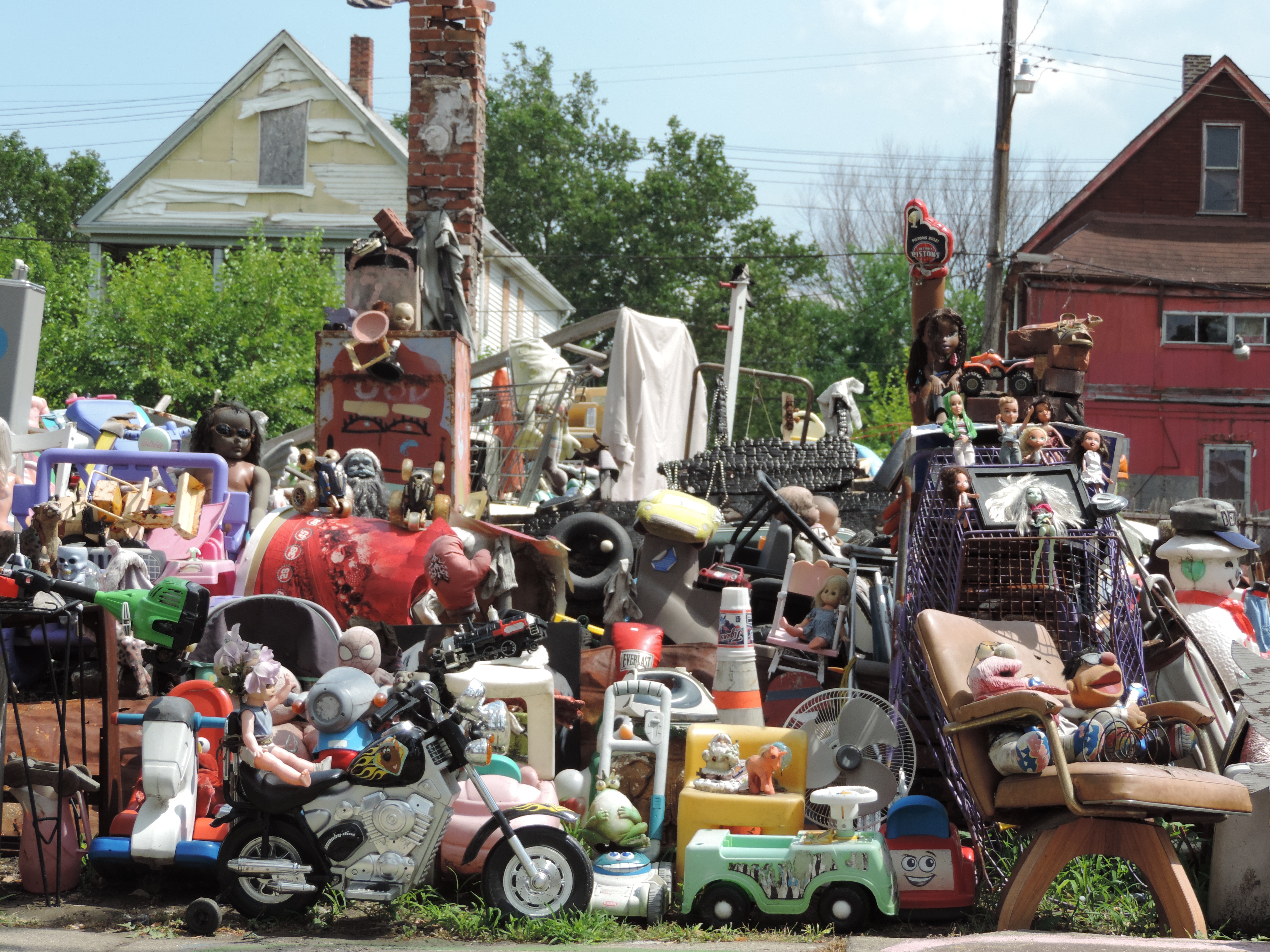 Een andere toeristische tip is het Heidelberg Project (een jaar geleden ook beschreven door mijn zusje in een gastblog!). De reviews op internet zijn gemengd: de een vindt het een geweldige vorm van openbare buitenkunst; een ander vindt het maar rommel. Het Heidelberg Project is een openlucht kunstproject van twee ‘blocks’ aan Heidelberg Street. De oprichter is kunstenaar Tyree Guyton. Het is in 1967 gestart, deels als politiek protest tegen de rellen die de stad teisterden in die periode. Hij beschilderde huizen en de straat, vooral met stippen, en maakte veel ‘spullen’ vast aan de buitenkant van huizen, vooral in een thema.