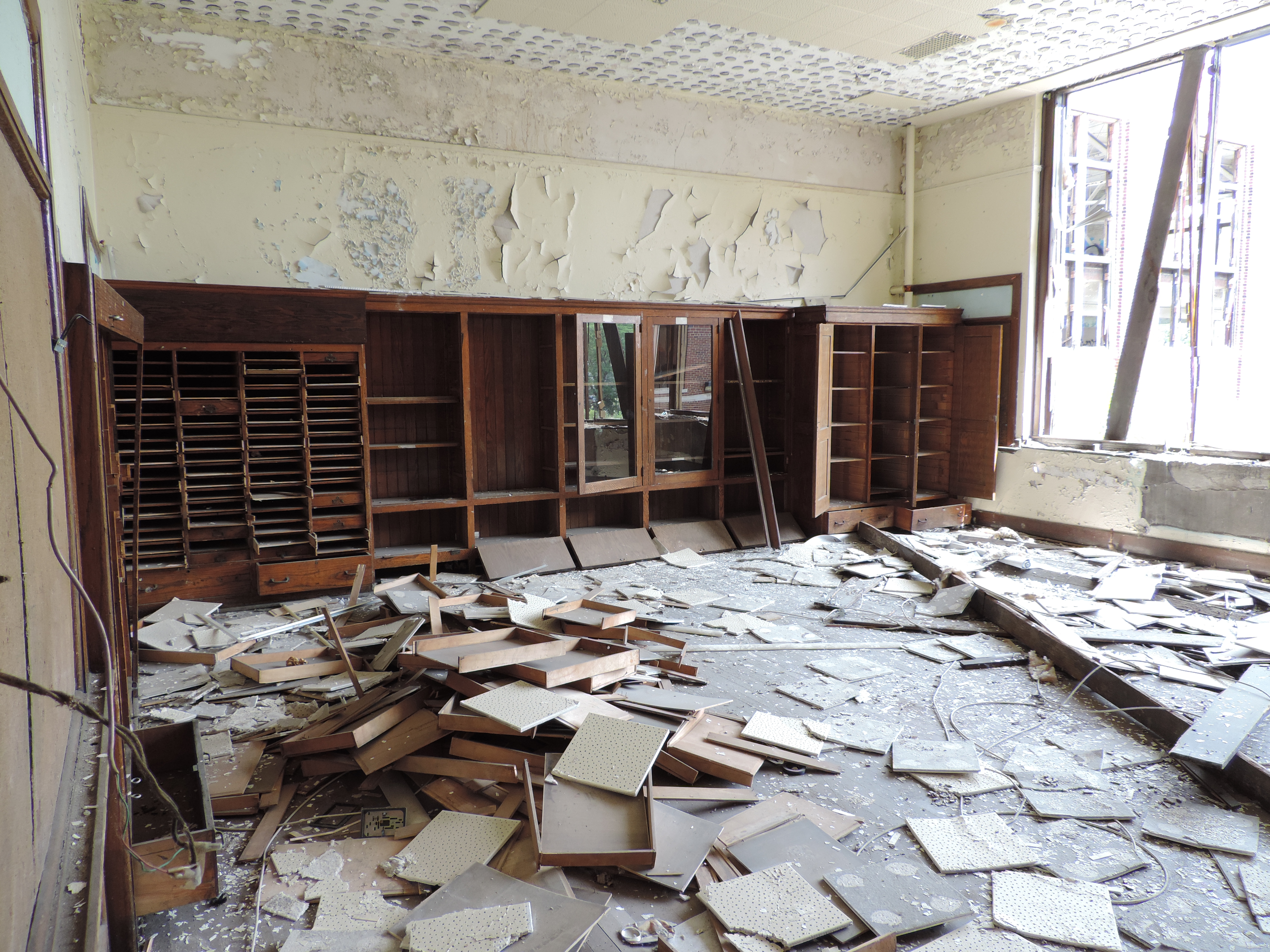 Deze school is gebouwd in 1922, en zoals zoveel scholen in Detroit, door dalende aantallen scholieren gesloten in 2011. Op het hoogtepunt waren er ruim 2000 scholieren die naar deze school gingen – en aan het einde waren er dat nog maar 229. Dat kan niet meer uit… De eerste twee jaar werd het schoolgebouw nog bewaakt, maar in 2013 werd het gebouw geplunderd en werd het meeste metaal uit het gebouw gehaald. Bij dat soort gebouwen is het wonderlijk hoe snel het verval gaat. Het blijkt dat zodra de ramen gesneuveld zijn, het snel gaat: zeker in de hete zomers en de enorm koude winters van Detroit heeft het ‘weer’ snel vat op gebouwen en valt het plafond snel naar beneden.