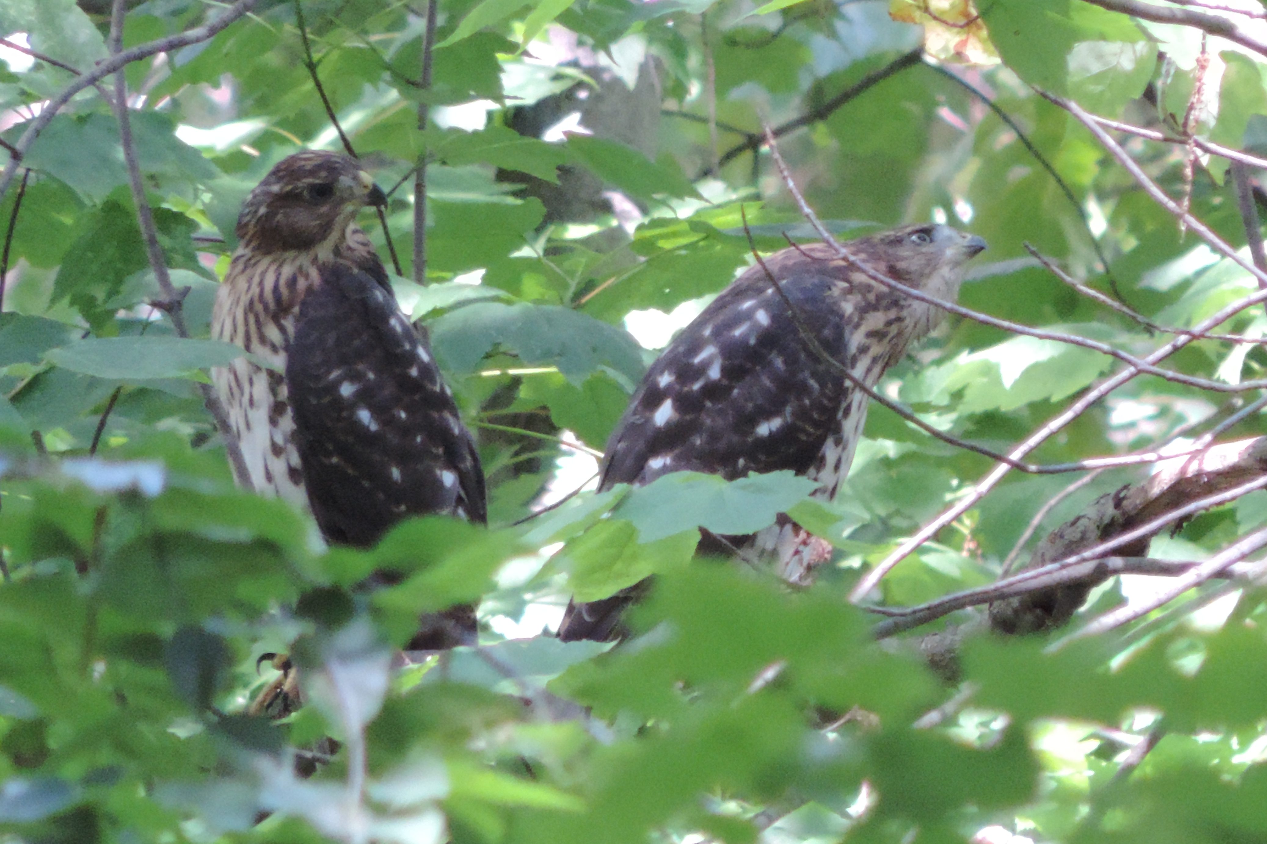 En dan zijn er nog twee jonge Red Tailed Hawks die uit het nest zijn gekomen. Ze blijven veel bij elkaar, doen elkaar veel na, en zijn nog wat kleiner dan hun ouders. Nog steeds heel erg indrukwekkend om te zien: