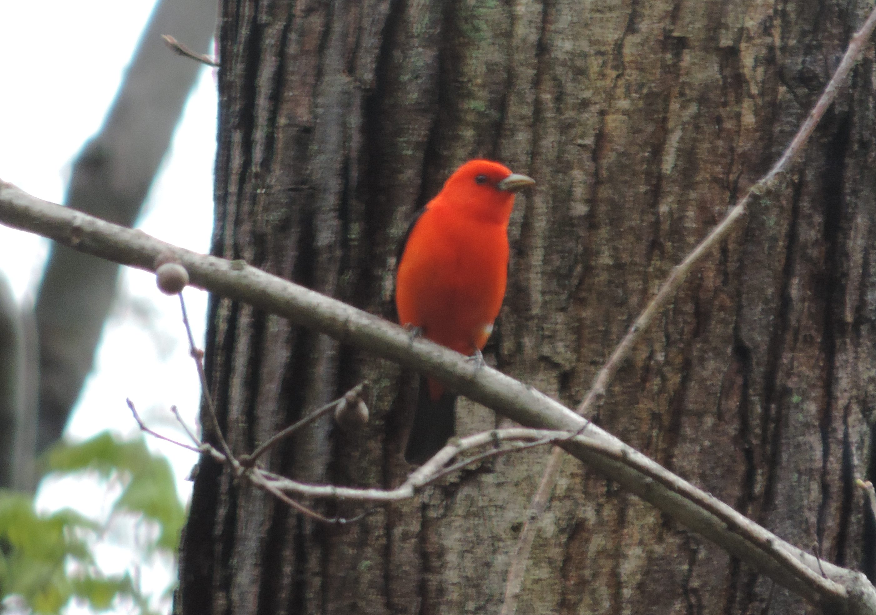 Deze is weer dankzij Michiel – ik heb de vogel zelf niet gezien (maar wel geidentificeerd). Op het eerste gezicht denk je “hee, een Northern Cardinal” als je zo’n rode vogel ziet, maar dat klopt in dit geval niet. Deze vogel heeft zwarte vleugels, heeft geen kuif, en is een klein beetje kleiner dan de Northern Cardinal. Dit is de Scarlet Tanager (er zijn heel veel meer tanagers in Amerika). Leuk detail: in de winter zijn ze geel met zwarte vleugels.