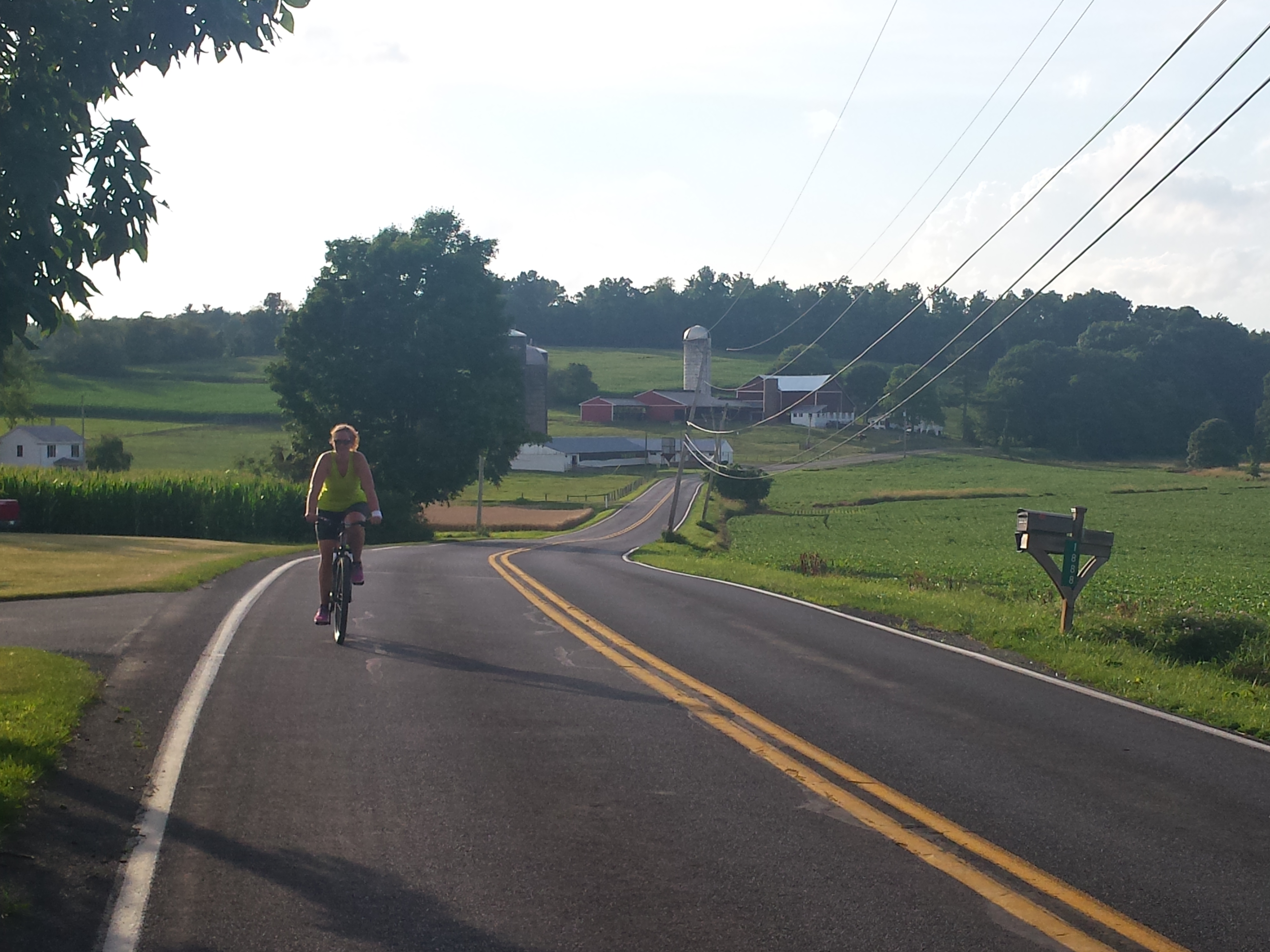 De route tussen huis en school is mooi, maar erg heuvelig, en zeker op de terugweg best uitdagend. Maar er is meer: ook buiten State College kun je prachtig fietsen (als je eenmaal de juiste fiets hebt, dus, niet de Nederlandse transportfiets). Michiel weet dit al, en doet dit al twee jaar, en ik ben nu dus ook een paar keer meegegaan. Weliswaar op ‘makkelijke’ rondjes, die een stuk korter (30 tot 40 km in plaats van 100 kilometer) en een stuk minder steil zijn (maar nog steeds heuvelig hoor, op bepaalde stukken), en ook met gravel – en afgelopen weekend zelfs op een mountainbike pad (dat naar mijn mening eigenlijk geen ‘pad’ mocht heten). Mijn benen houden het prima, mijn handen zijn een ander verhaal (dat vertel ik later nog wel een keer), en ik krijg er ook wel een zere kont van op langere stukken, maar over het algemeen gaat het me goed af. Ik ga natuurlijk lang niet zo snel als Michiel kan, voor hem is het dan ook meer een ‘uitrustrondje’ op zijn off-days…. verschil moet er zijn.