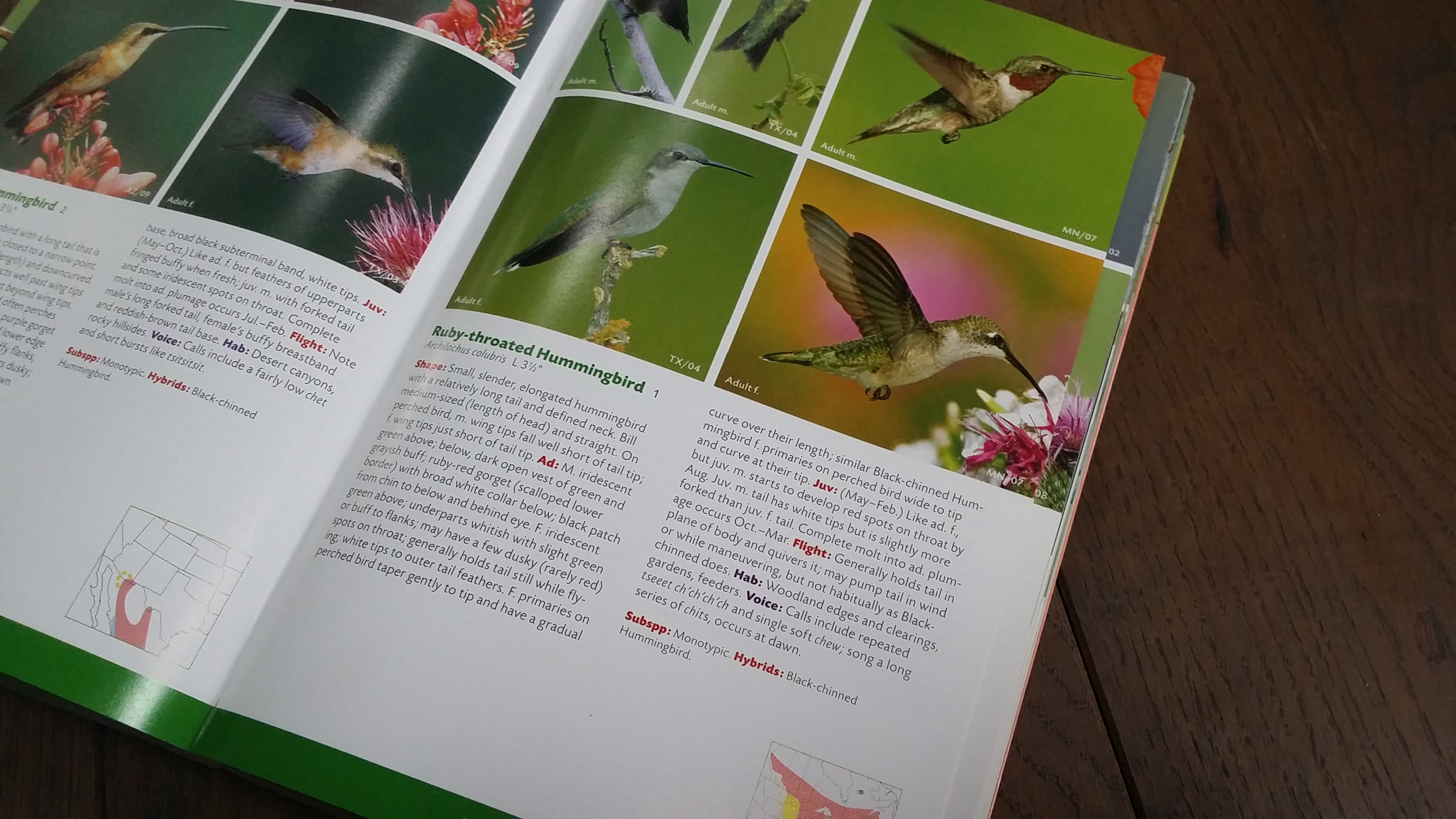 Nu was de identificatie eenvoudig. Hoewel er in de Verenigde Staten tientallen soorten kolibries zijn, is er maar een soort in Pennsylvania maar een soort: de Ruby-throated Hummingbird. Op de foto in mijn vogelgids is ie – helaas – beter te zien.