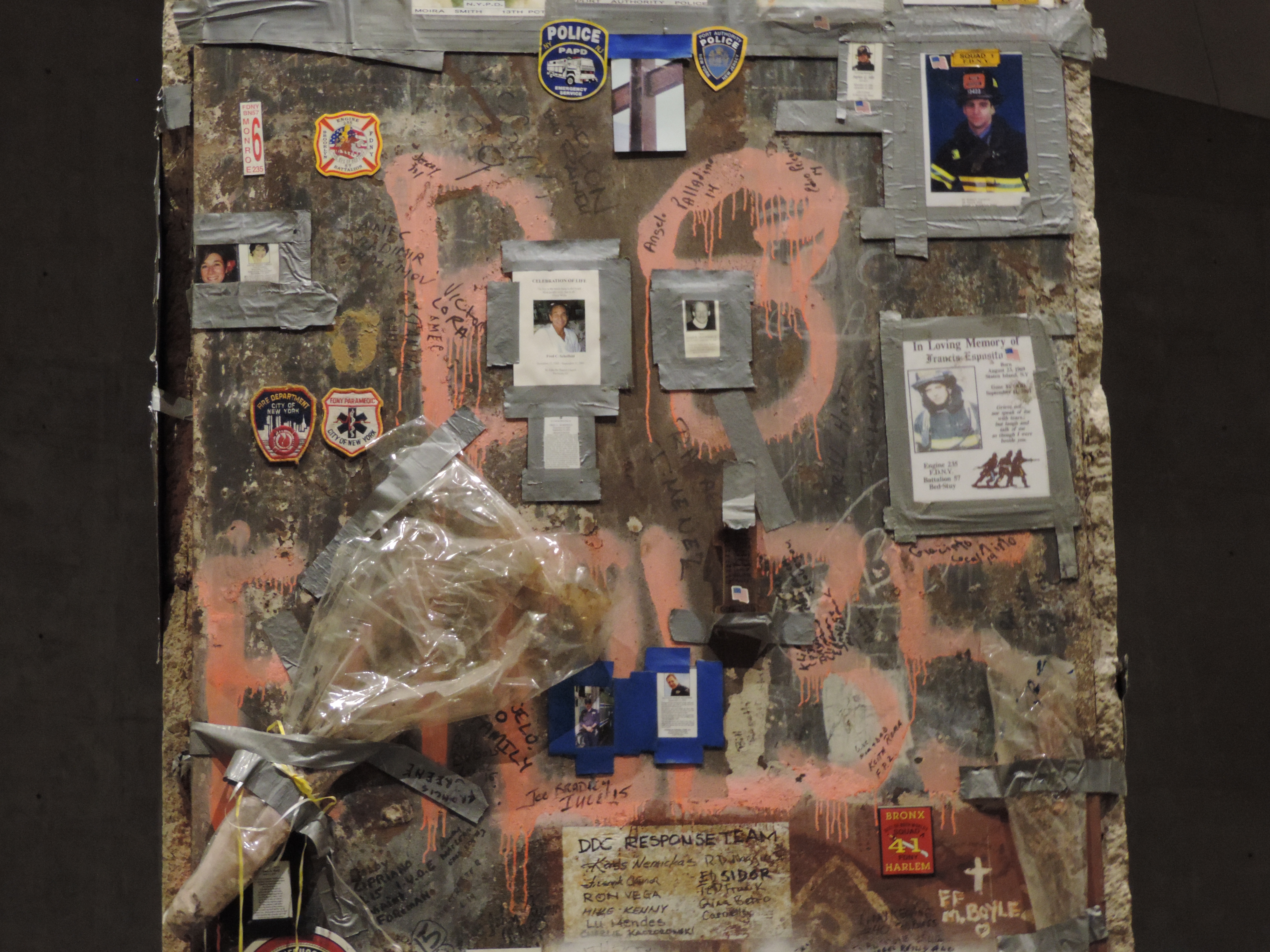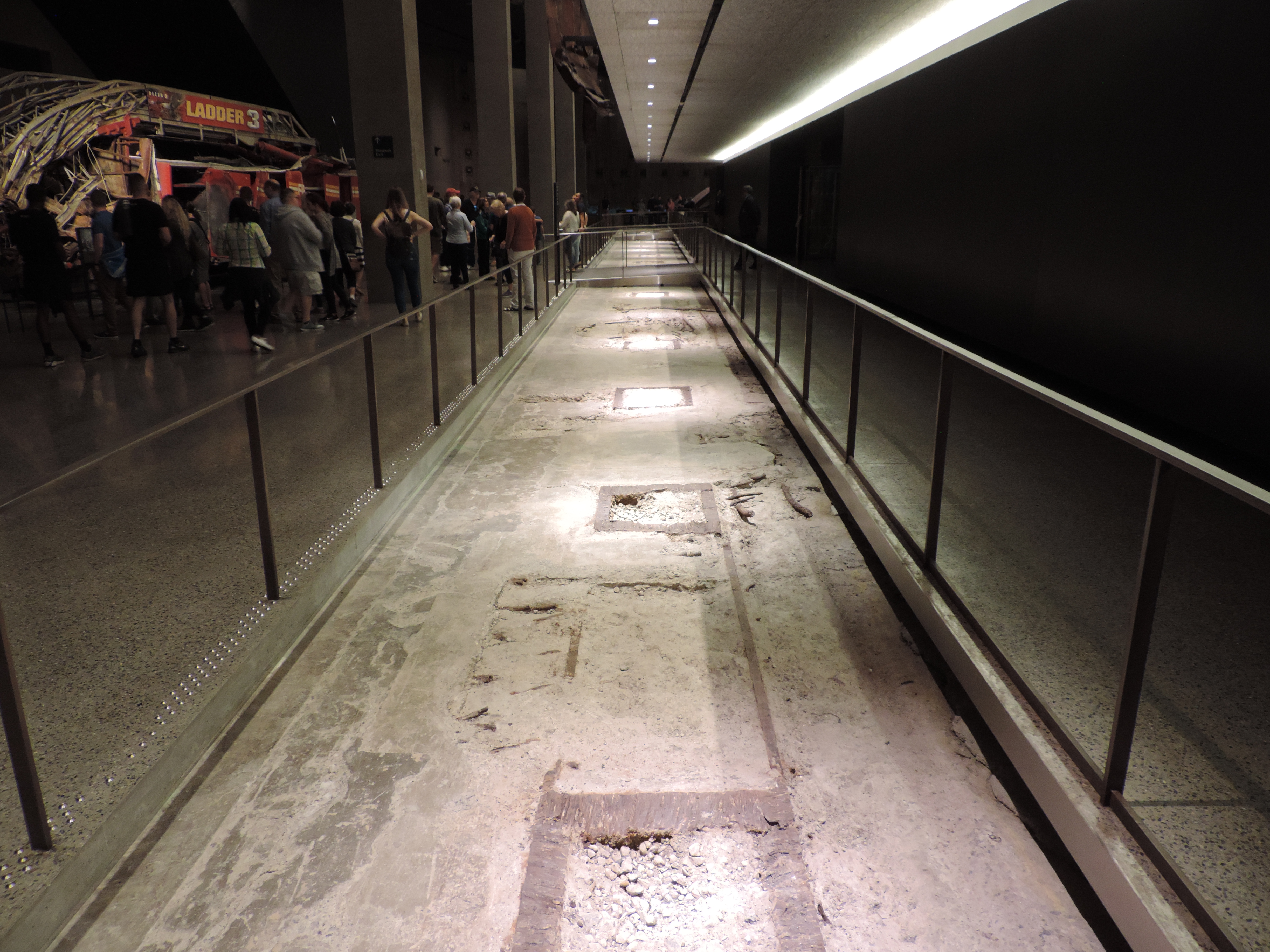 Emma, Corey, Michiel en ik hadden die ochtend een rondleiding door een gids geboekt. Daardoor kregen we een hoop extra achtergrondinformatie te horen dan dat wij anders zouden horen… Net als overigens in het Judisches Museum het geval is, is het 9-11 Museum in twee delen ondergebracht. Aan de ene kant is er het ‘ruimtelijke’ deel waar een paar grote artifacten staan – denk dan aan grote stukken gewrongen staal (ongelooflijk…), een brandweerwagen van Ladder Company 3 (brandweergroep 3), en een stuk trap uit een van de Twin Towers. In dat deel doet de schuine architectuur van Libeskind goed zijn werk. Hier mag je foto’s maken.