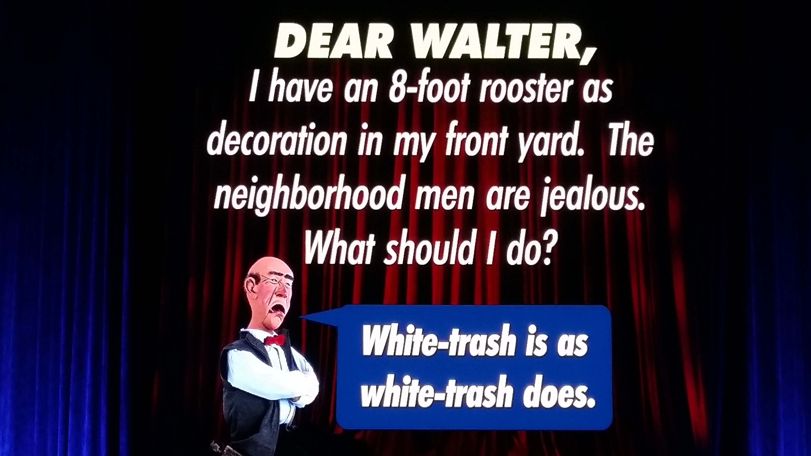 De grootste ‘grap’ kwam in het begin van de avond. Ik had bij binnenkomst al om me heen gekeken en had al gezien dat dit niet het typische State College publiek was. Er zaten bovengemiddeld veel hilbilly’s in het publiek. Hoe zie je dat…? Eh… kleding (te veel pyjamabroeken, joggingbroeken en sweatpants in het publiek, en dat lieg ik niet). Gewicht. Haarstijl. Kauwgom. Heel Erg Grote bekers frisdrank. Jeff Dunham kent schijnbaar z’n pappenheimers, want hij peilde z’n publiek even aan het begin van de avond. Zo wist ie wat voor politieke vlees ie in de kuip had, en welke grappen hij beter kon thuislaten.