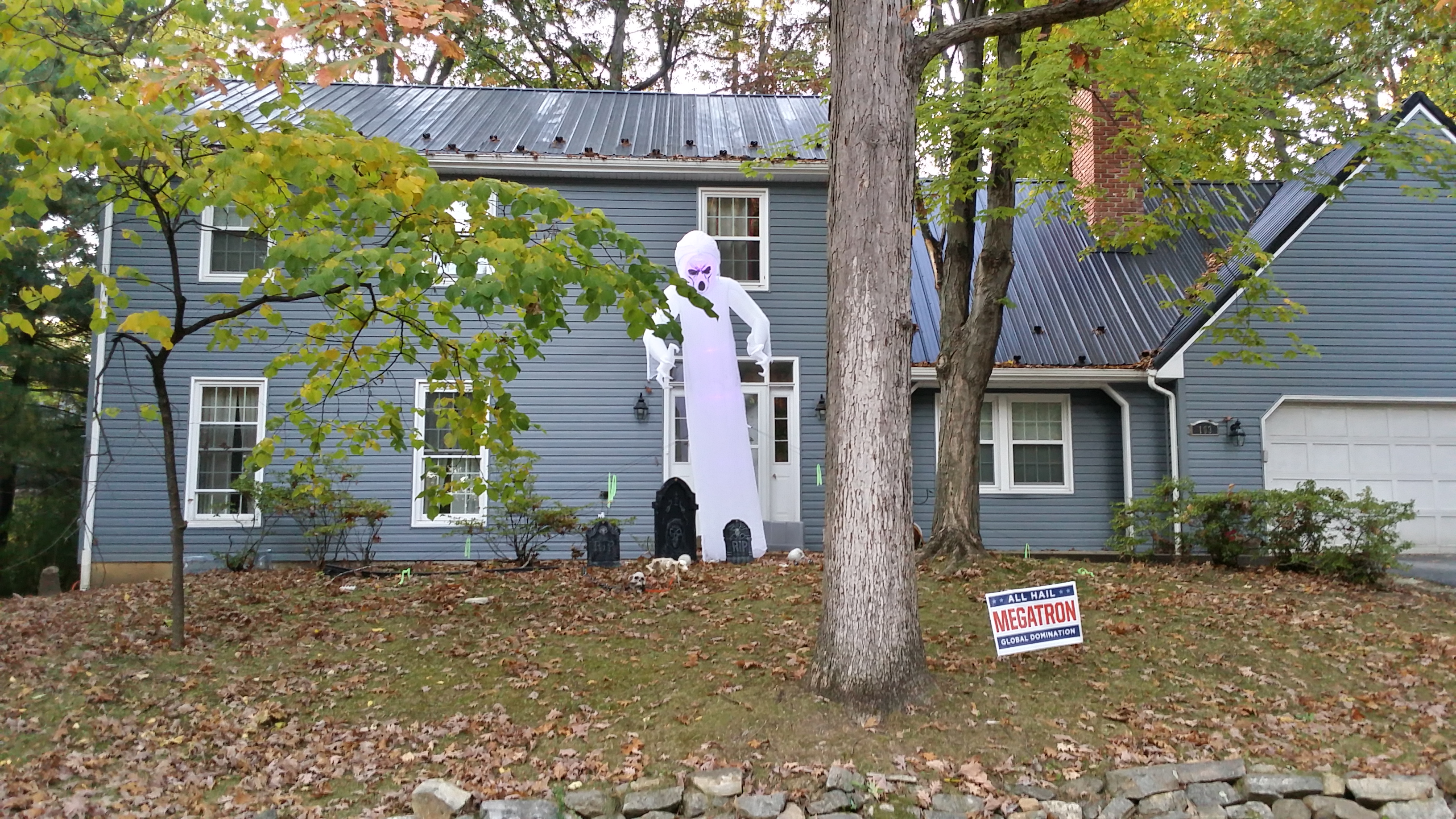 Hoe dan ook – het is in Amerika een reden om huizen te versieren. Ik heb een paar foto’s gemaakt de afgelopen week. Creatief met pompoenen en skeletten!