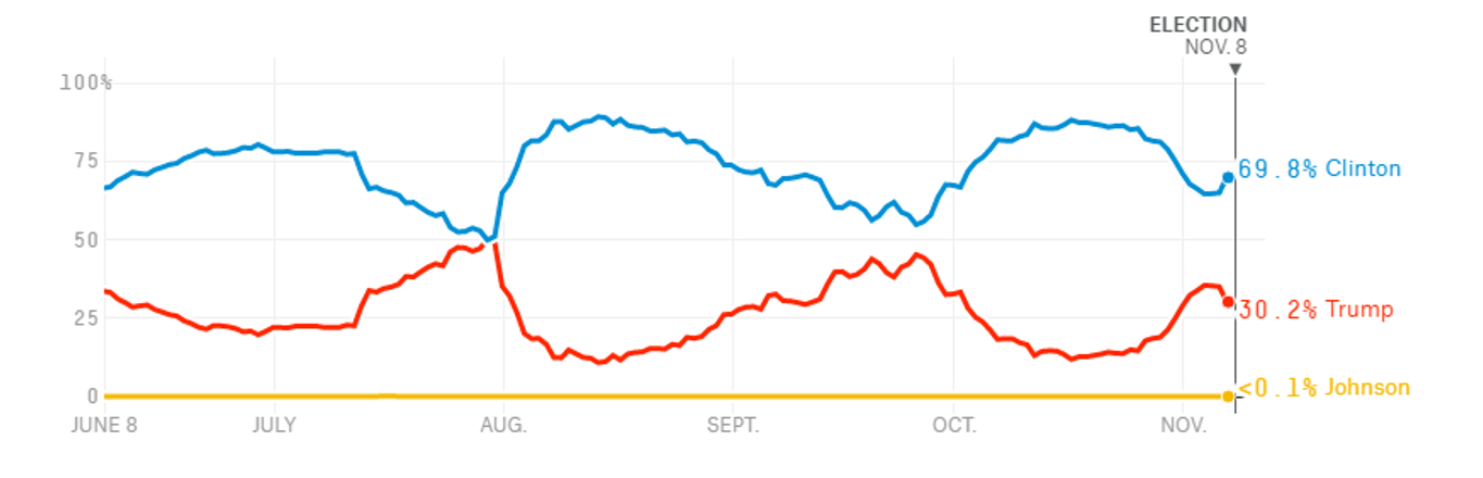 Volgens de laatste peilingen heeft Hillary Clinton wel ruim twee keer zoveel kans om president te worden, dat is in principe geruststellend (want ik ben absoluut voor Hillary Clinton en tegen Donald Trump als je me deze keuze voor zou leggen), maar 30% kans op een Donald Trump ramp-presidentschap vind ik persoonlijk 30% te veel.