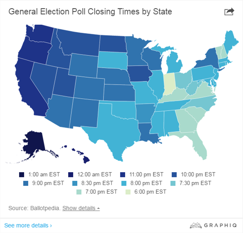 Goed. Er wordt dus gestemd. En wanneer is er de uitslag? Een paar uur later wanneer iedereen klaar is… Nu is er een complicerende factor in Amerika – we hebben hier tijdzones. Wij zitten in de meest oostelijke tijdzone (het tijdverschil met Nederland is 6 uur). In California zijn ze 3 uur later (het tijdverschil met Nederland is 9 uur), en er zitten ook nog staten tussenin, zoals Minnesota en Utah. Dan zijn er ook nog Alaska (vier uur later) en Hawaii (vijf uur later) maar die staten hebben zo weinig kiesmannen en zijn geen swingstates, en dus maken ze weinig verschil voor de verkiezingsuitslag. Al met al duurt het even voordat iedereen in Amerika uitgestemd is. En het duurt dus even voordat alle resultaten bekend zijn.