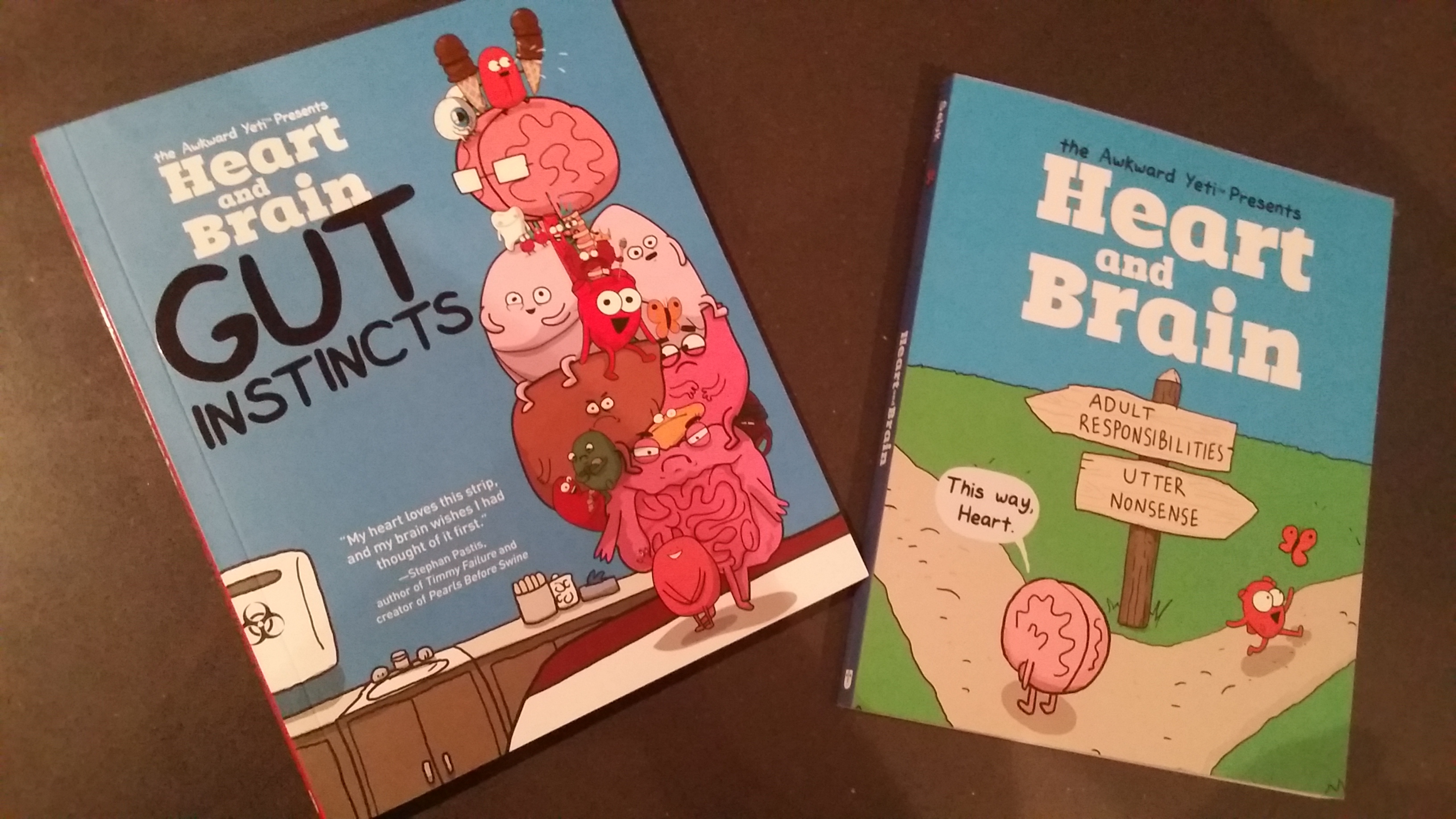 Heart and Brain gaat over de tensie tussen gevoel en ratio, en doet dat op een hele leuke manier, soms teruggrijpend op psychologie (en heel soms consumentenpsychologie, zelfs!). Na een tijdje heeft het aantal karakters zich uitgebreid en zitten er meer organen in de strip, denk aan Bowels (de dikke darm, die is altijd geirriteerd), Stomach (maag, heeft altijd zin in eten, en de reden waarom Bowels chagrijnig wordt), Gallbladder (galblaas, een schattig groen ding met een grammatica probleem die constant steentjes maakt: “I maked these”, terwijl dat helemaal niet de bedoeling is), Lungs (de longen, die zich vooral bij sport gevangen voelen in de ribbenkast), en ga zo maar door… Bijzonder grappig. Niet in het minst omdat de biologie (en dus de psychologie) achter de strips klopt en er vaak heel erg grappig in verwerkt wordt. En de strip is schitterend getekend. Smile on my face.