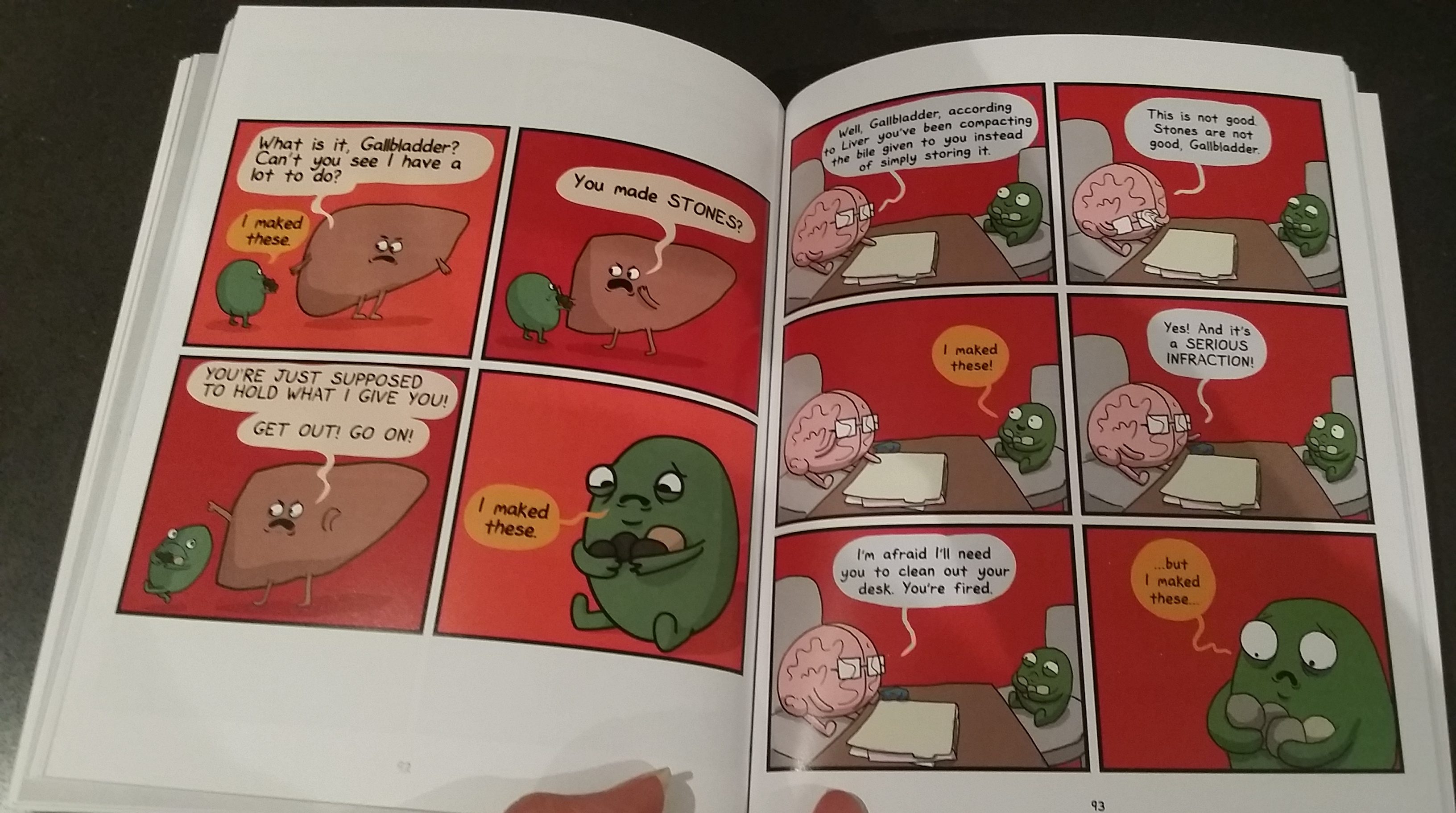 Niet alleen volg ik deze strip online, ik heb laatst ook deze twee strips in boekvorm gekocht. Wat een heel erg leuk cadeau voor mezelf 🙂 Een van mijn favoriete karakters – gallbladder – staat er gelukkig ook in. Ik word hier gewoon vrolijk van. En dat mag ook wel, in deze tijd!