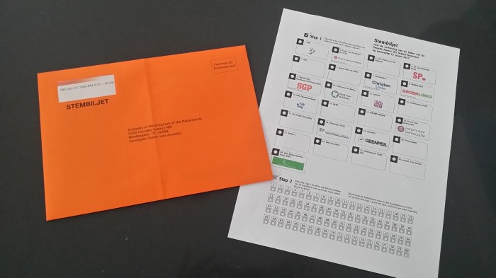 Stap 2 is het ontvangen van de stempas met de post. Snailmail… en ja, dat duurde lang. Gelukkig kwamen ze bij ons net op tijd. Wij hebben een stembiljet gekregen dat er vrij raar uit ziet. Misschien ziet het er hetzelfde uit als in Nederland, maar ik vond ‘m vrij apart: wij moesten eerst voor een partij kiezen, en vervolgens voor een nummer, corresponderend met een plek op de lijst. Er zit vast een reden achter dit ontwerp, maar het is niet bepaald ‘foolproof’ lijkt me… Uiteraard kregen we er ook uitlegblaadjes bij, en twee enveloppen. Het stembiljet moest in een witte envelop, en dat moest samen met de stempas in een oranje envelop naar de ambassade. De ambassade kan met die stempas controleren of ik inderdaad mag stemmen, net als op het stembureau.