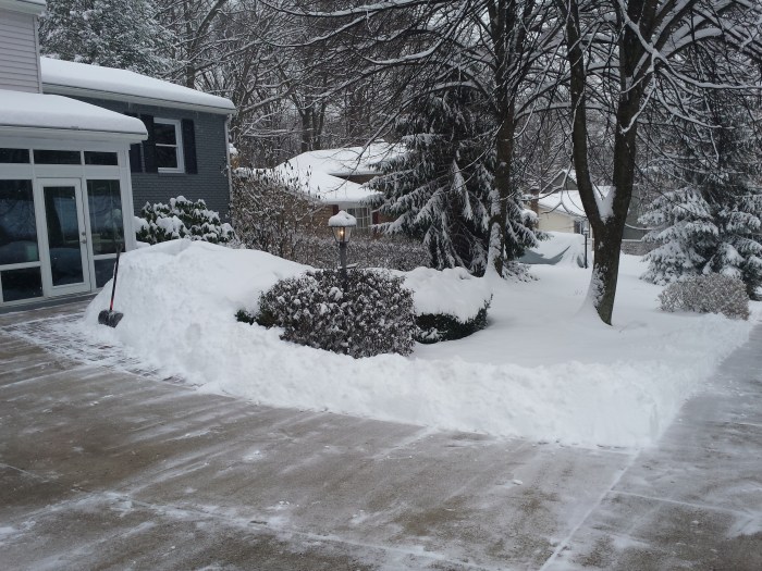 De sluiting van Penn State was niet voor niets. Maandagavond begon het met sneeuwen, en het bleef sneeuwen tot aan dinsdagavond aan toe (en wordt nog gevolgd door nog een paar dagen met ‘flurries’, dat zijn wat flarden met sneeuwbuien, volgens mij hebben wij daar in het Nederlands niet echt een woord voor…). Op dinsdagochtend lag er inderdaad een dikke 25 centimeter sneeuw, en later op de dag haalden we inderdaad de ‘foot’ (30 centimeter). Nu wonen wij in een doodlopend stuk en zijn wij vrij laat aan de beurt in het sneeuwschuifrooster van de township, dus voor negen uur kon ik ook echt niet naar kantoor. Dat was trouwens in het geheel niet aan te raden vanwege de dikke sneeuwbuien.