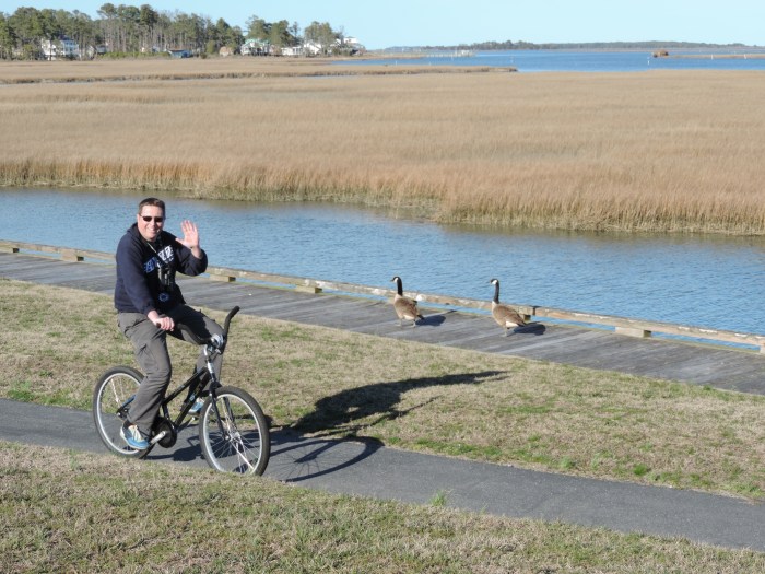 Tegenover ons hotel zat een fietsverhuur. En we zaten recht naast de brug naar Assateague waar de Wildlife Refuge zat. Wij hebben op woensdag en donderdag fietsen gehuurd en een paar rondjes in de Wildlife Refuge rondgefietst. Uitrusting: flesje water, verrekijken en camera (later deze week de vogelfoto’s!). Heerlijk ontspannen, dat konden we wel even gebruiken!